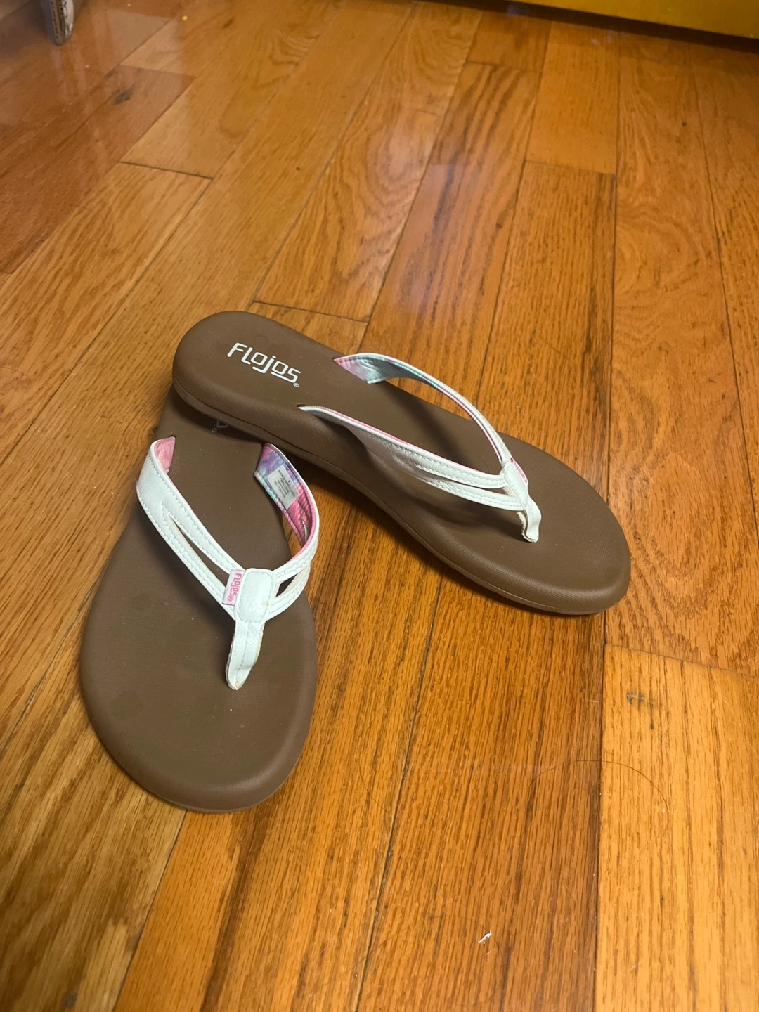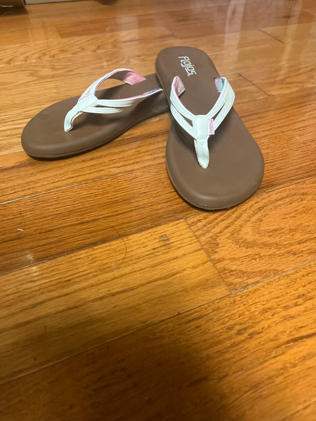 Selling a pair of Flojos flip flops. They are brown with white straps. They look to be in great condition!
