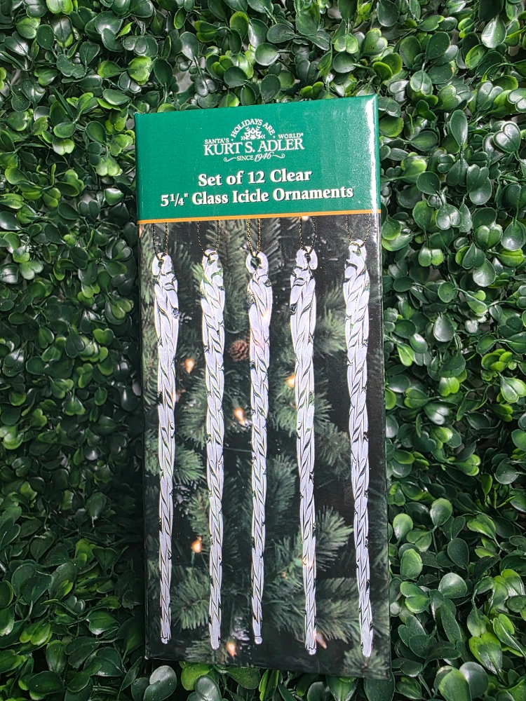 193Add a touch of sparkle to your holiday decor with this set of 12 clear glass icicle ornaments from Kurt S. Adler! Each ornament measures 5 1/4" and is perfect for hanging on your Christmas tree or using in other festive displays. Get ready to make your holidays shine! Best way to get a deal is if you make multiple offers on different items. I got lots of stuff for sale.