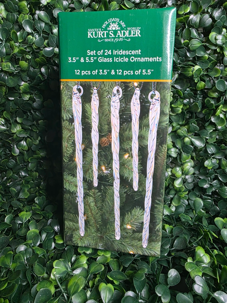 Add some sparkle to your holiday decor with this set of 24 iridescent glass icicle ornaments from Kurt S. Adler! The set includes 12 pieces of 3.5" ornaments and 12 pieces of 5.5" ornaments. Perfect for your Christmas tree or any festive display!