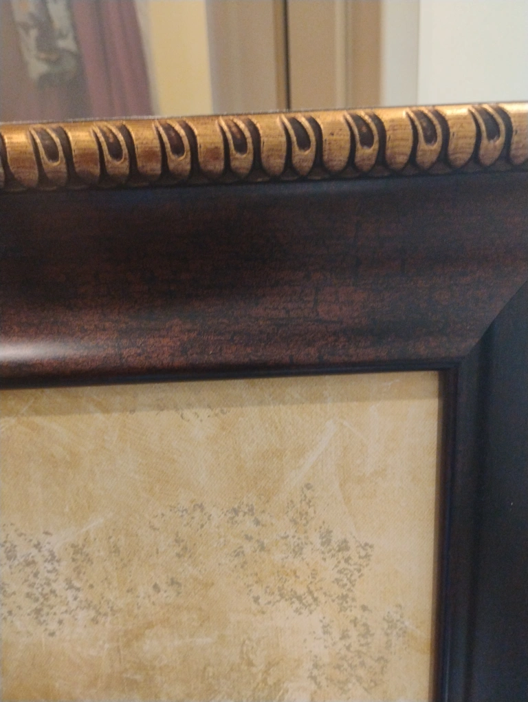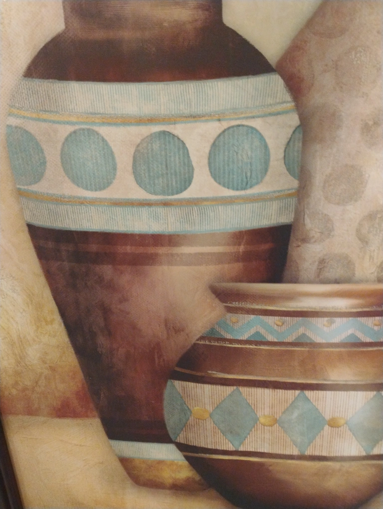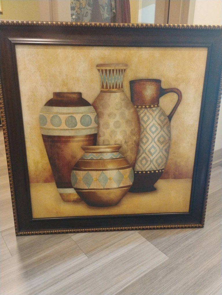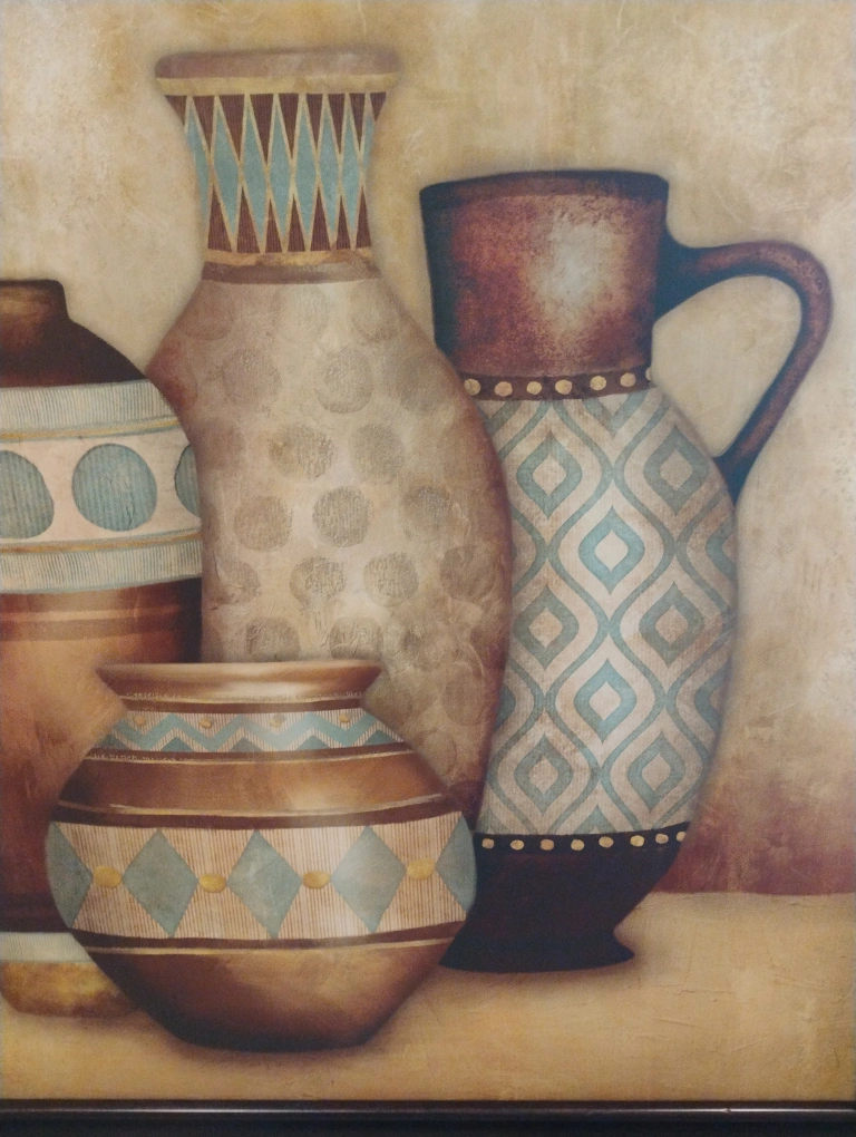 A framed art print featuring a collection of vases in earth tones with blue accents. The frame is a dark brown with a beaded edge. Perfect for adding a touch of warmth to any room!