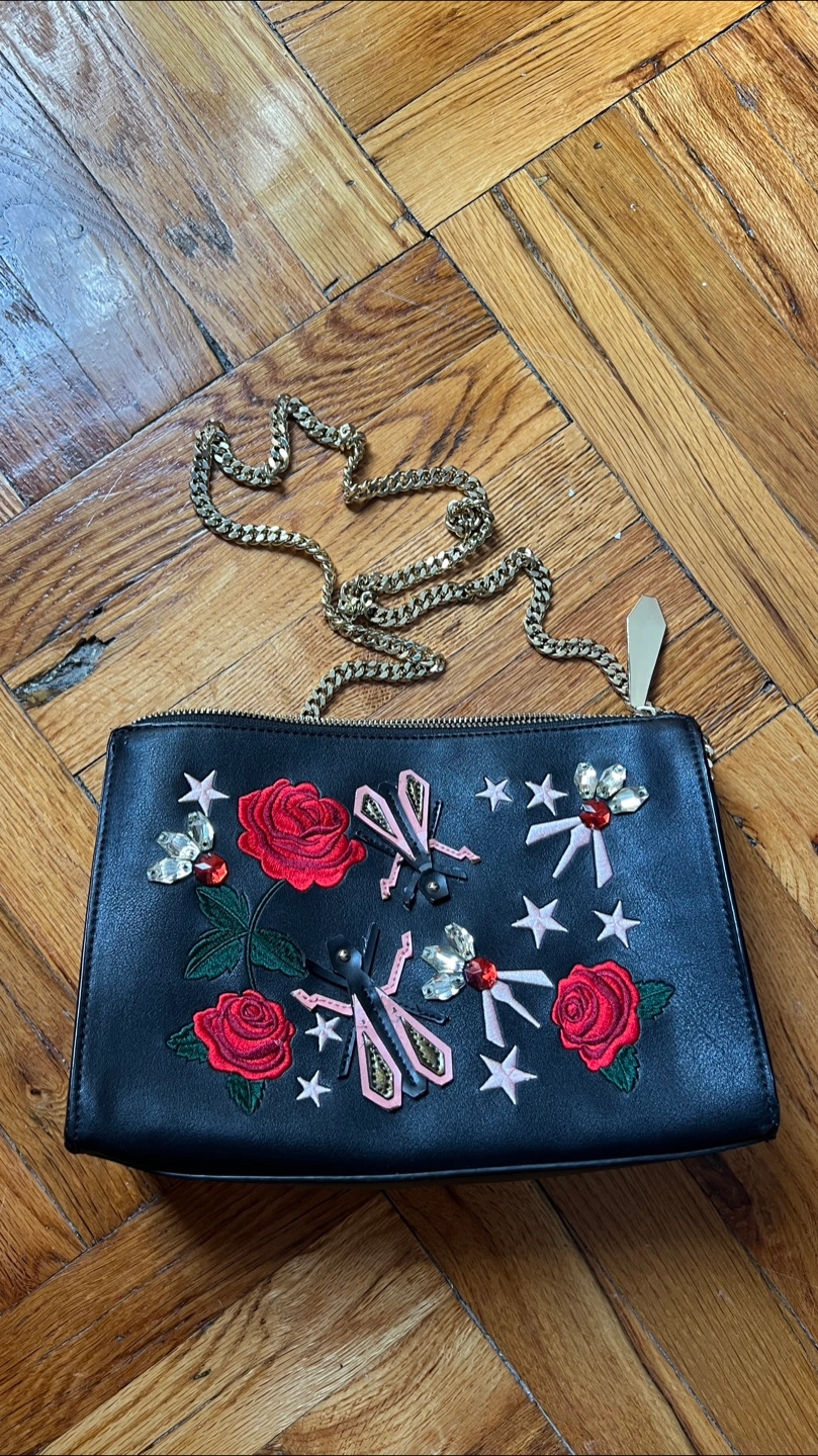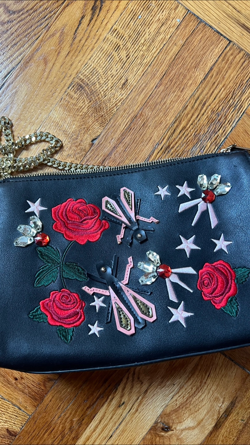 This is a stylish black clutch featuring a unique design with embroidered roses, stars, and insect embellishments. It has a gold-colored chain strap. This clutch is perfect for adding a touch of flair to any outfit!