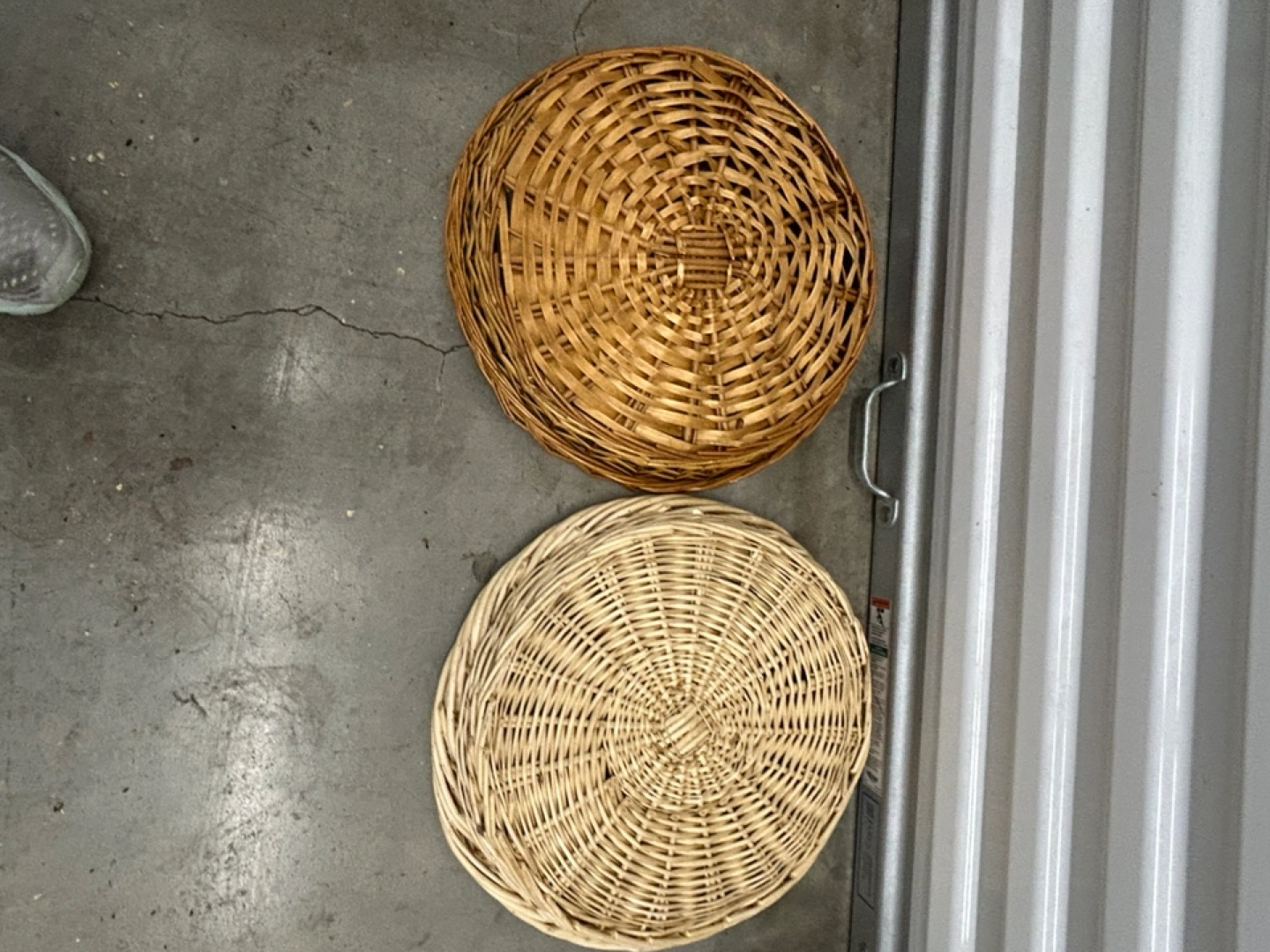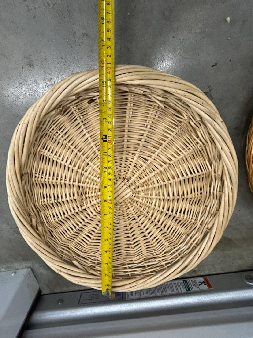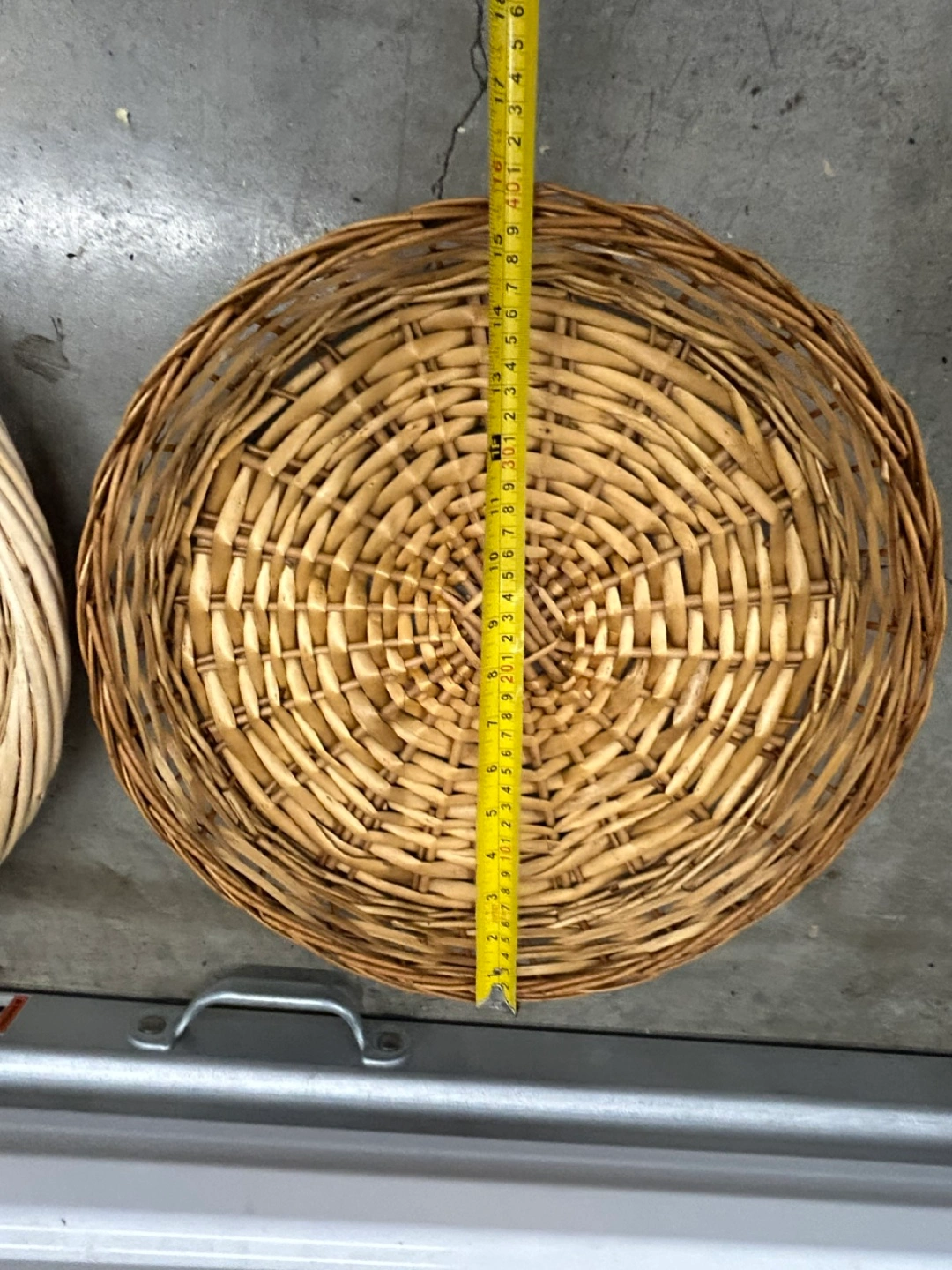 Selling a set of two wicker baskets. One is a darker brown color, and the other is a lighter tan. The darker basket is about 15 inches in diameter