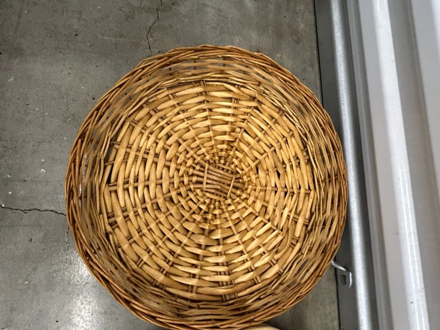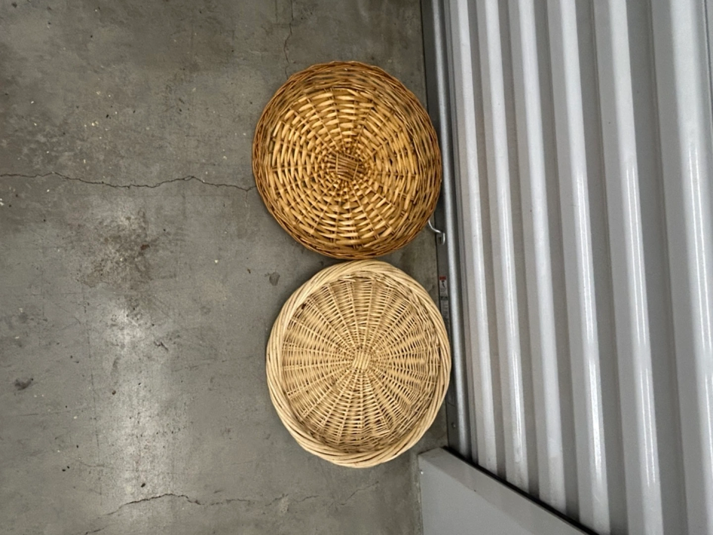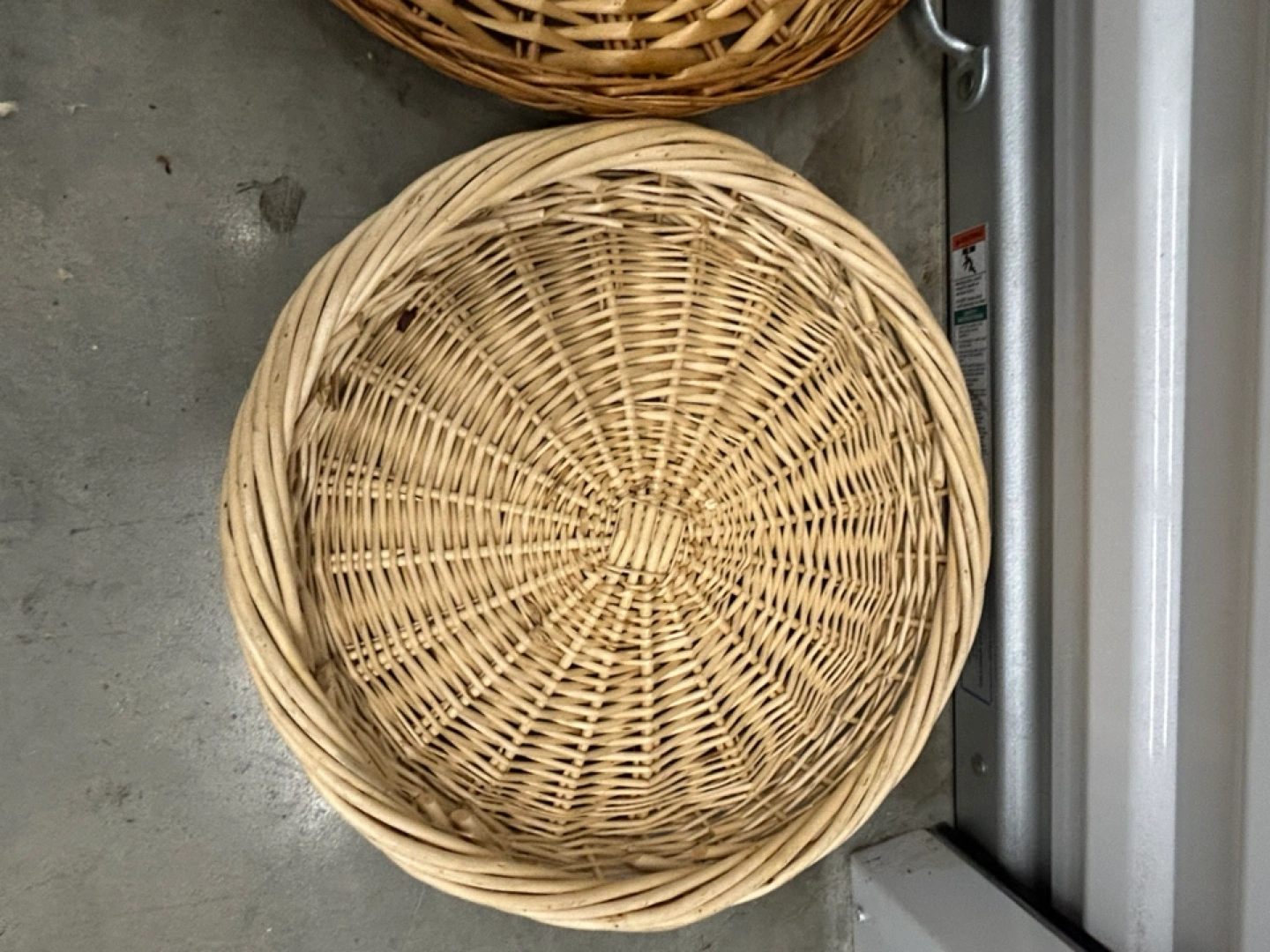 Selling a set of two wicker baskets. One is a darker brown color, and the other is a lighter tan. The darker basket is about 15 inches in diameter