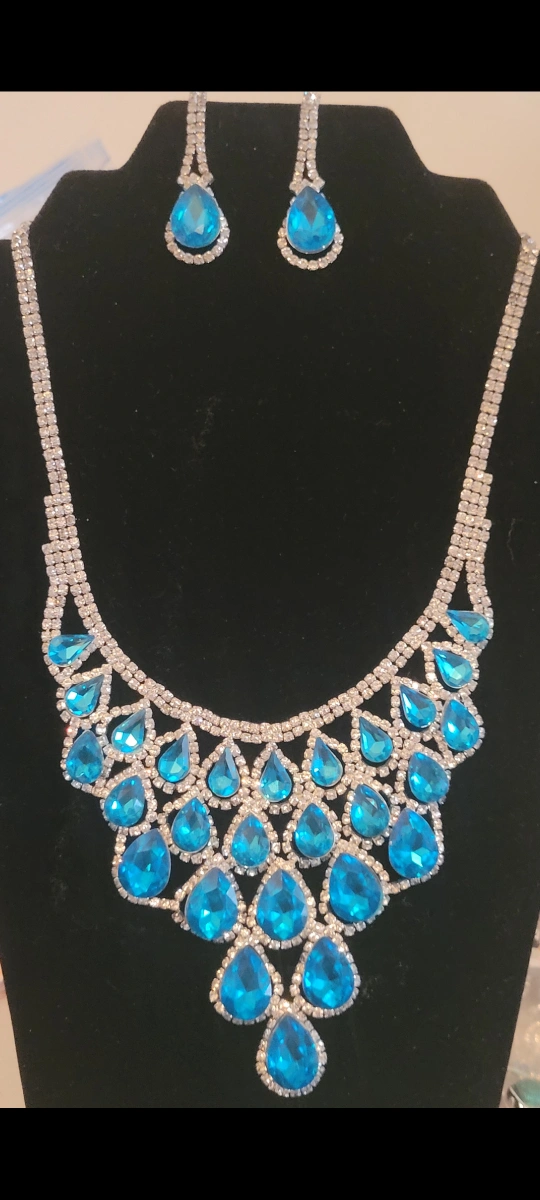 Beautiful blue rhinestone necklace and earring set! The necklace features a cascading design with teardrop-shaped blue rhinestones, complemented by matching teardrop earrings. Perfect for adding a pop of color and sparkle to any outfit