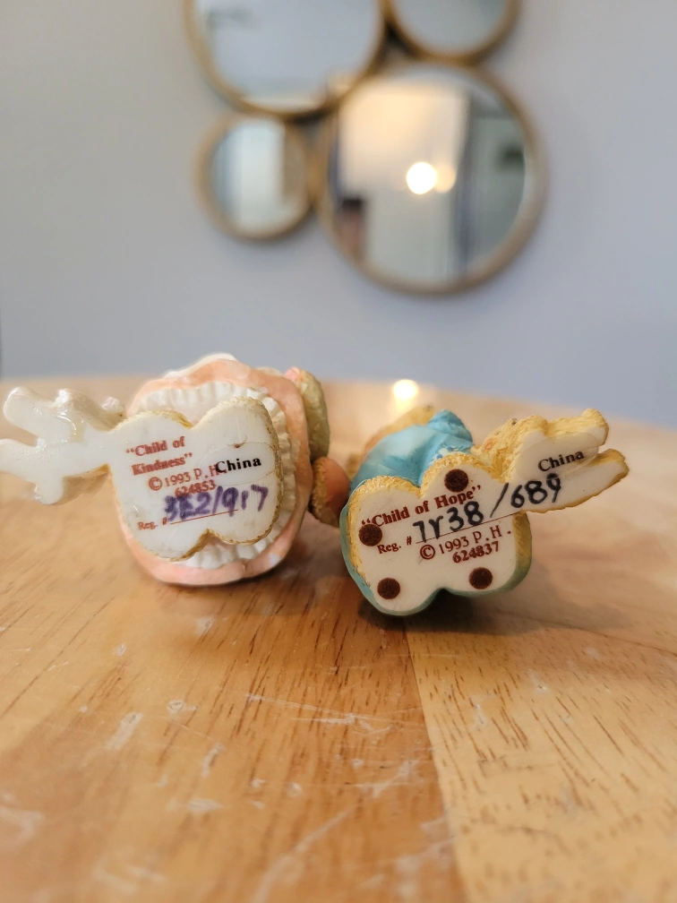 I have two adorable Enesco figurines from the 1993 "Child of" series! One is "Child of Hope" and the other is "Child of Kindness". They're in great shape and would make a lovely addition to any collection. Just a bit over 2 inches high. Both together for price. Feel free to check out my other unique items listed.