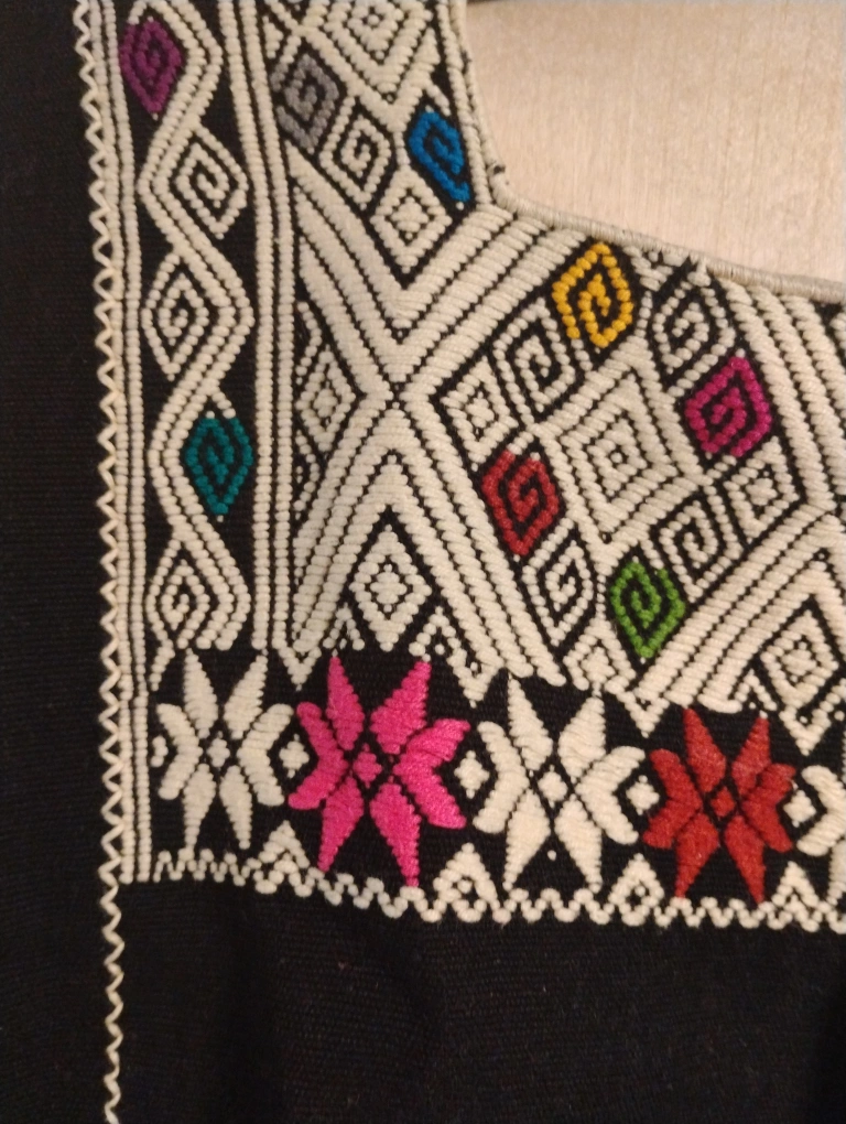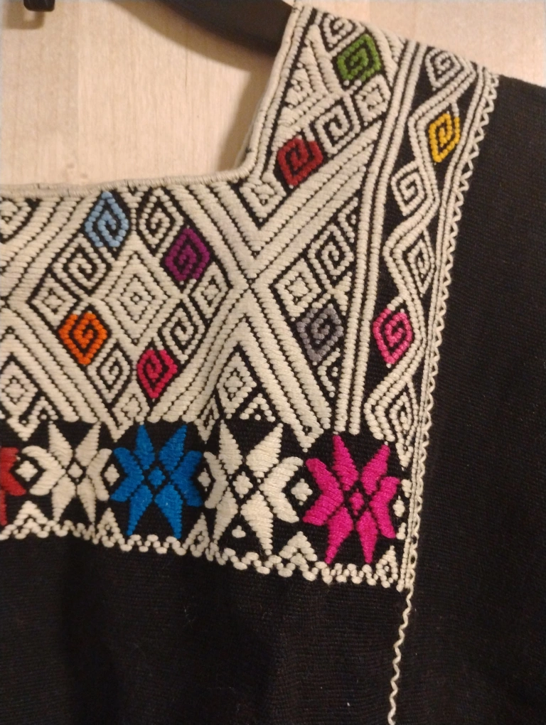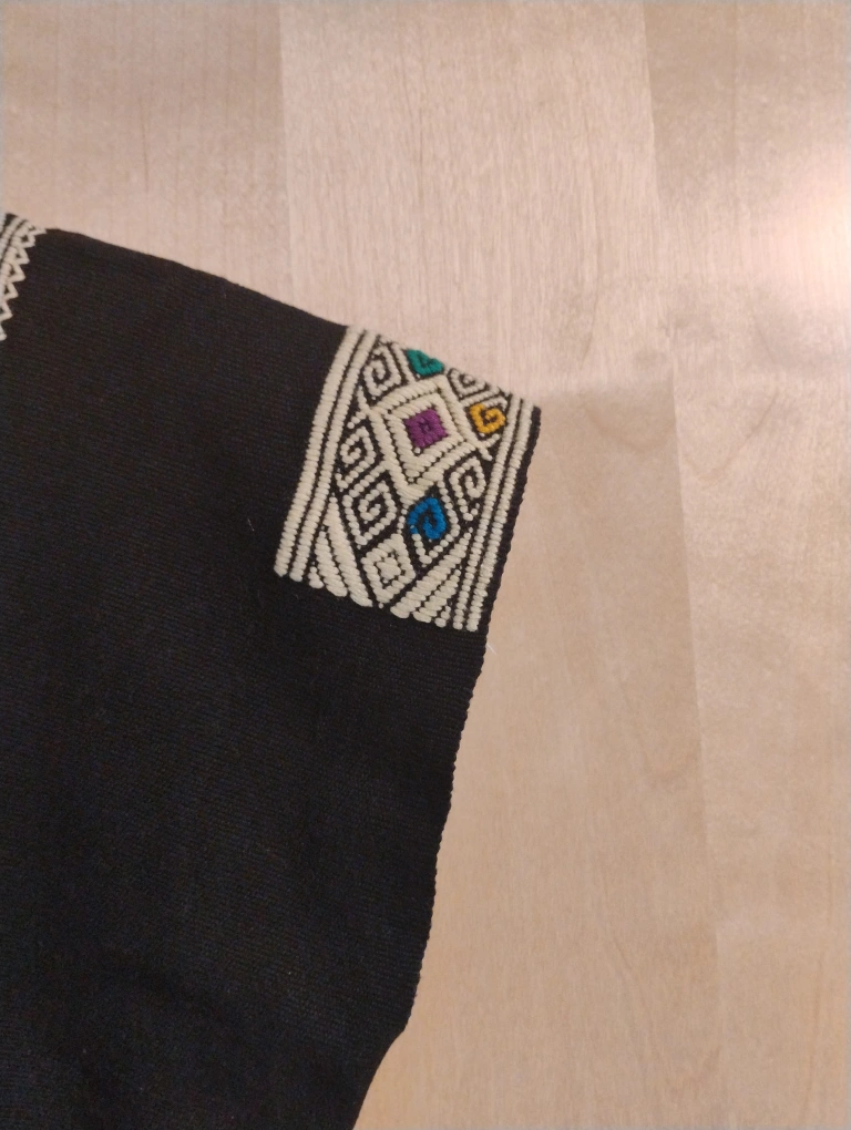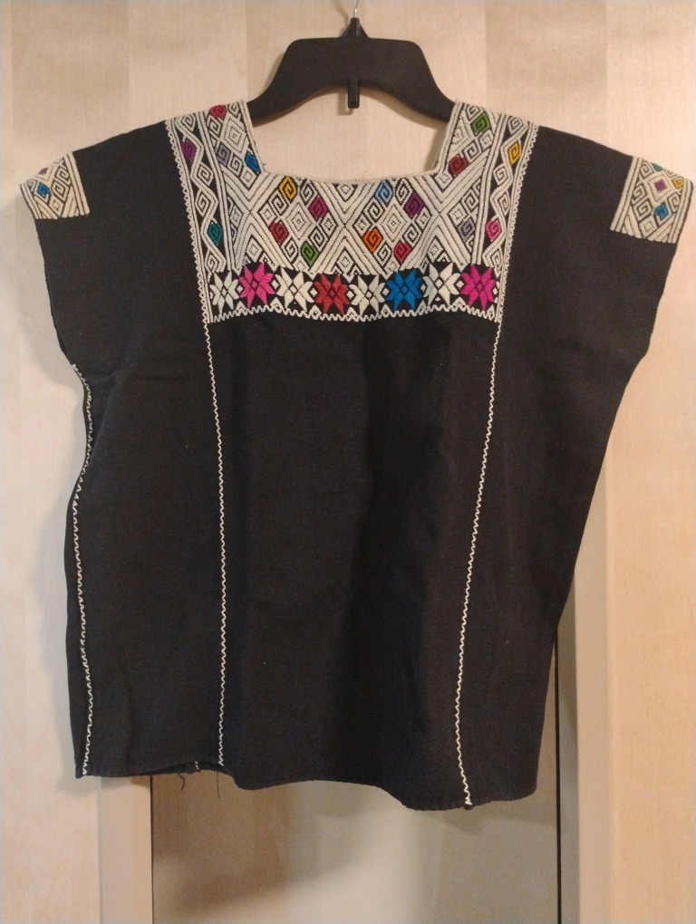 This is a beautiful black blouse with colorful hand embroidery around the neckline and sleeves. It's in great condition and ready for a new home! The material feels soft and comfortable, perfect for everyday wear or a special occasion