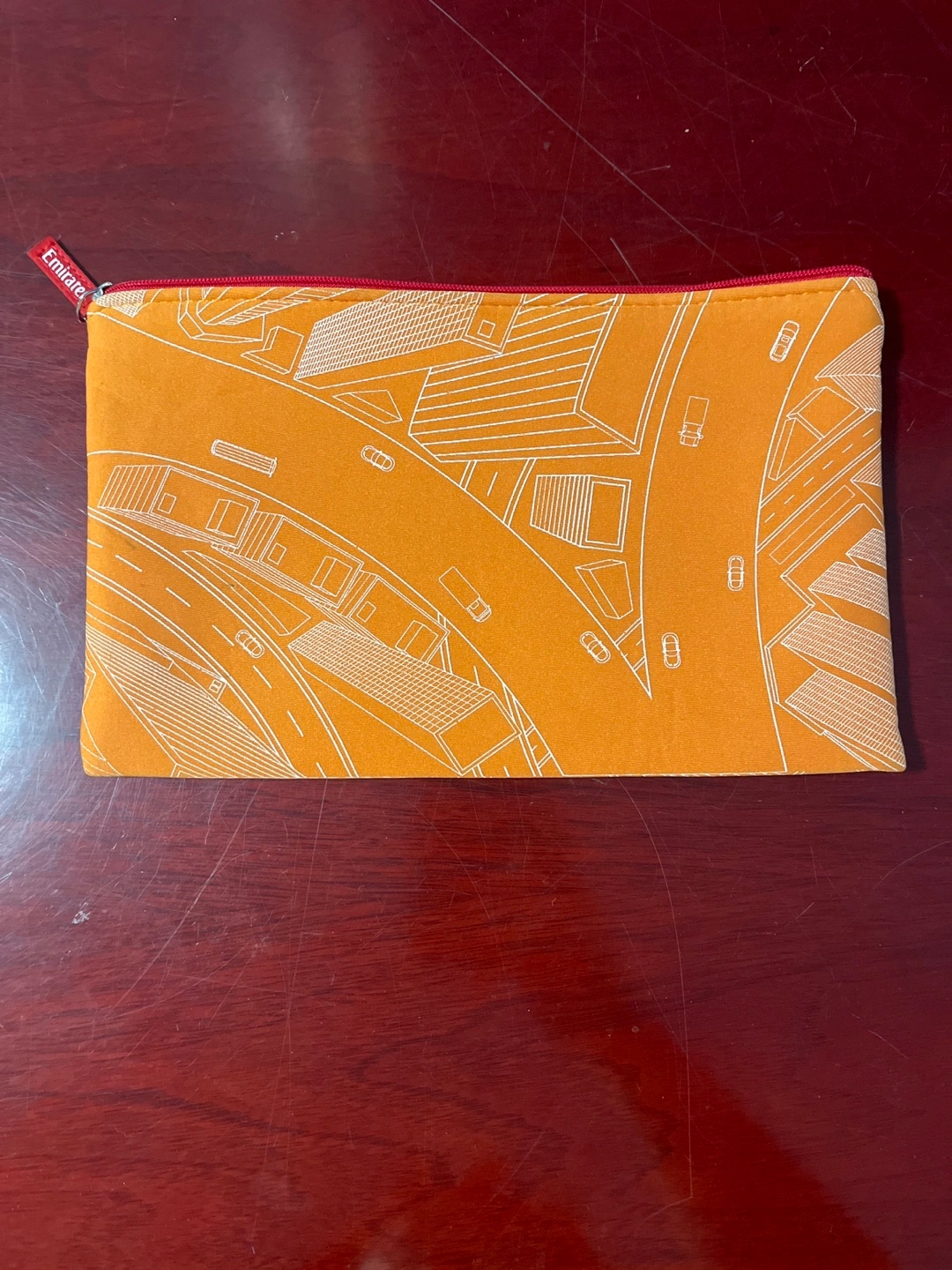 1000+Here's a cute yellow pouch from Emirates! It features a unique design with white line drawings and a red zipper. Perfect for storing small items on the go