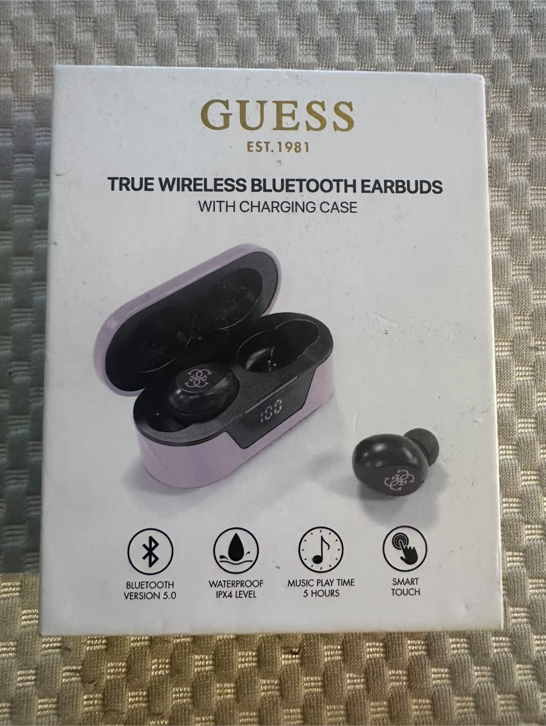 Selling a new pair of Guess True Wireless Bluetooth Earbuds with charging case! They are waterproof with an IPX4 level, feature Bluetooth version 5.0, and have a music play time of 5 hours. The box is included, along with all the original components like the charger and extra earbud tips.