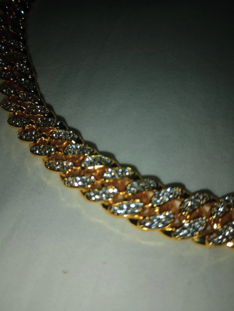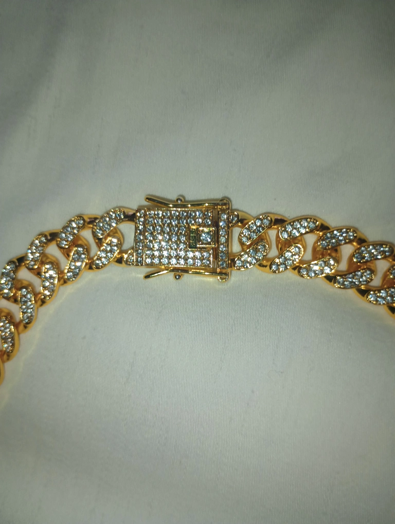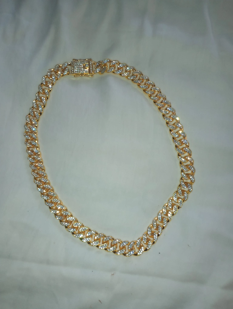 Selling a gold-colored Cuban link chain with diamond accents. It's in great condition and ready to add some shine to your style!