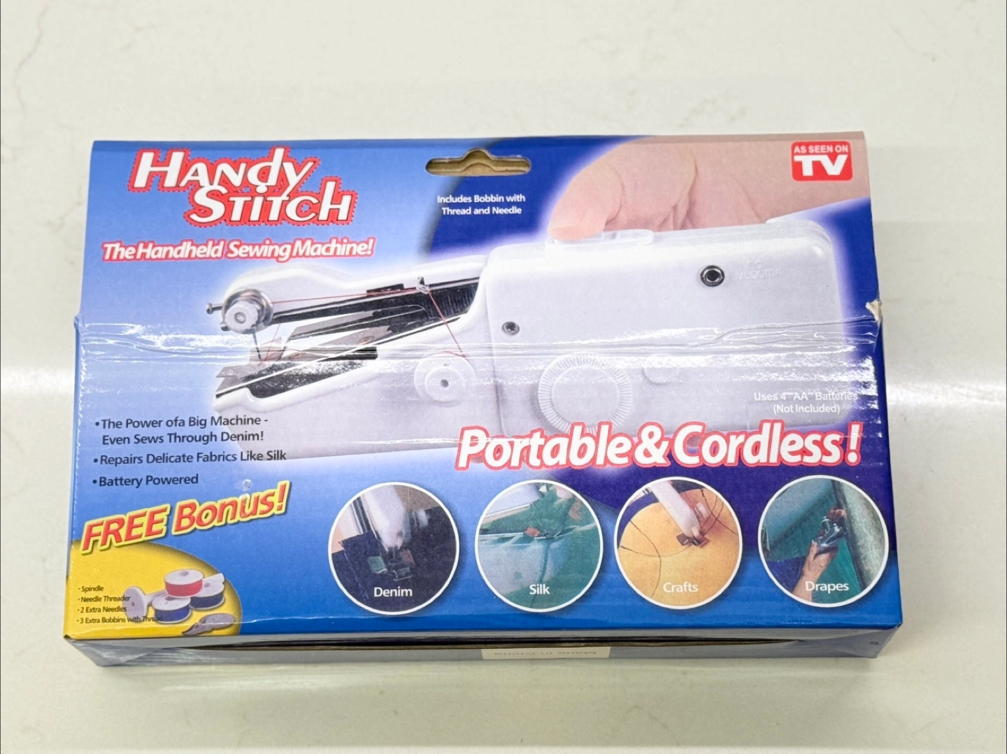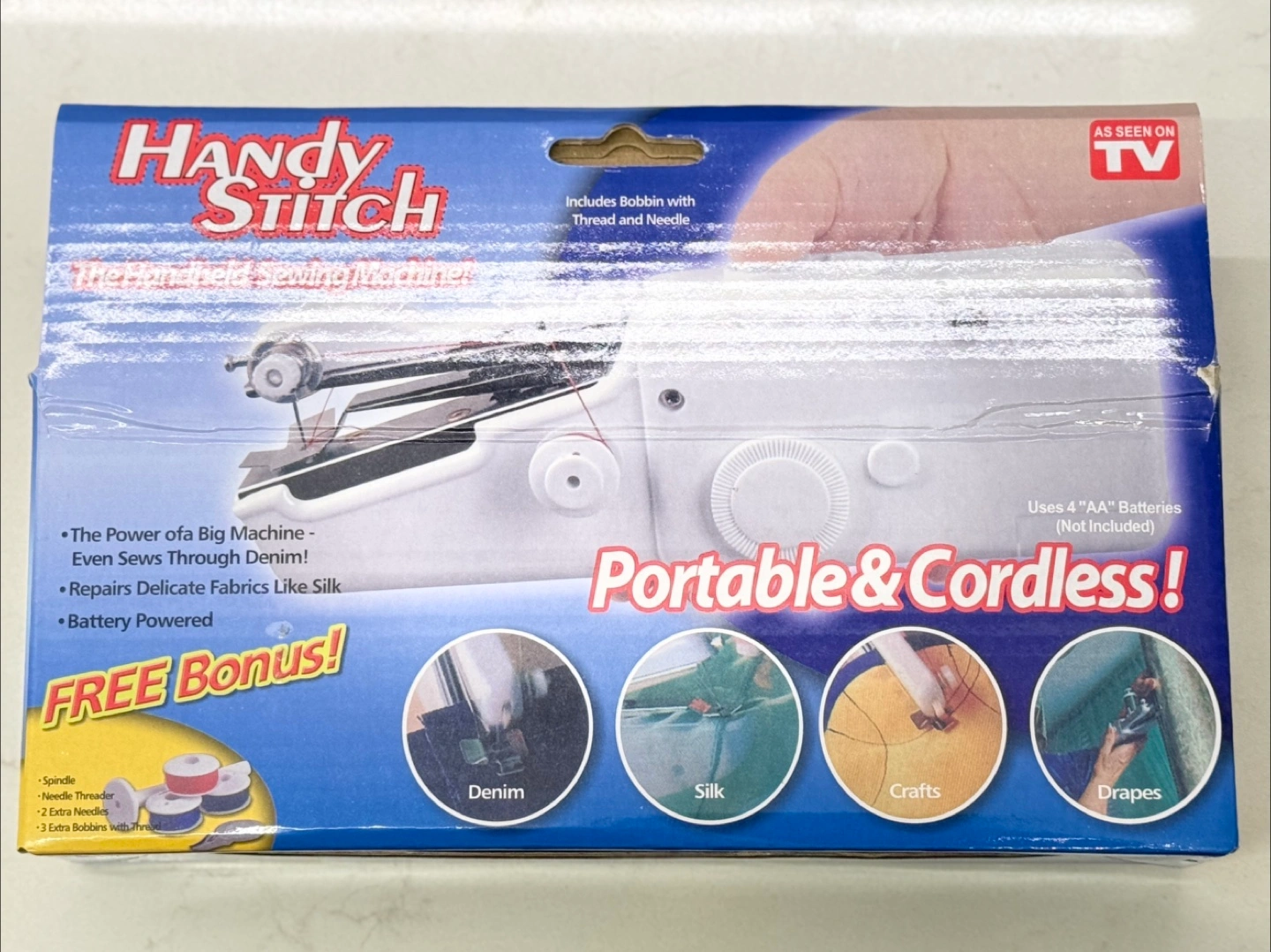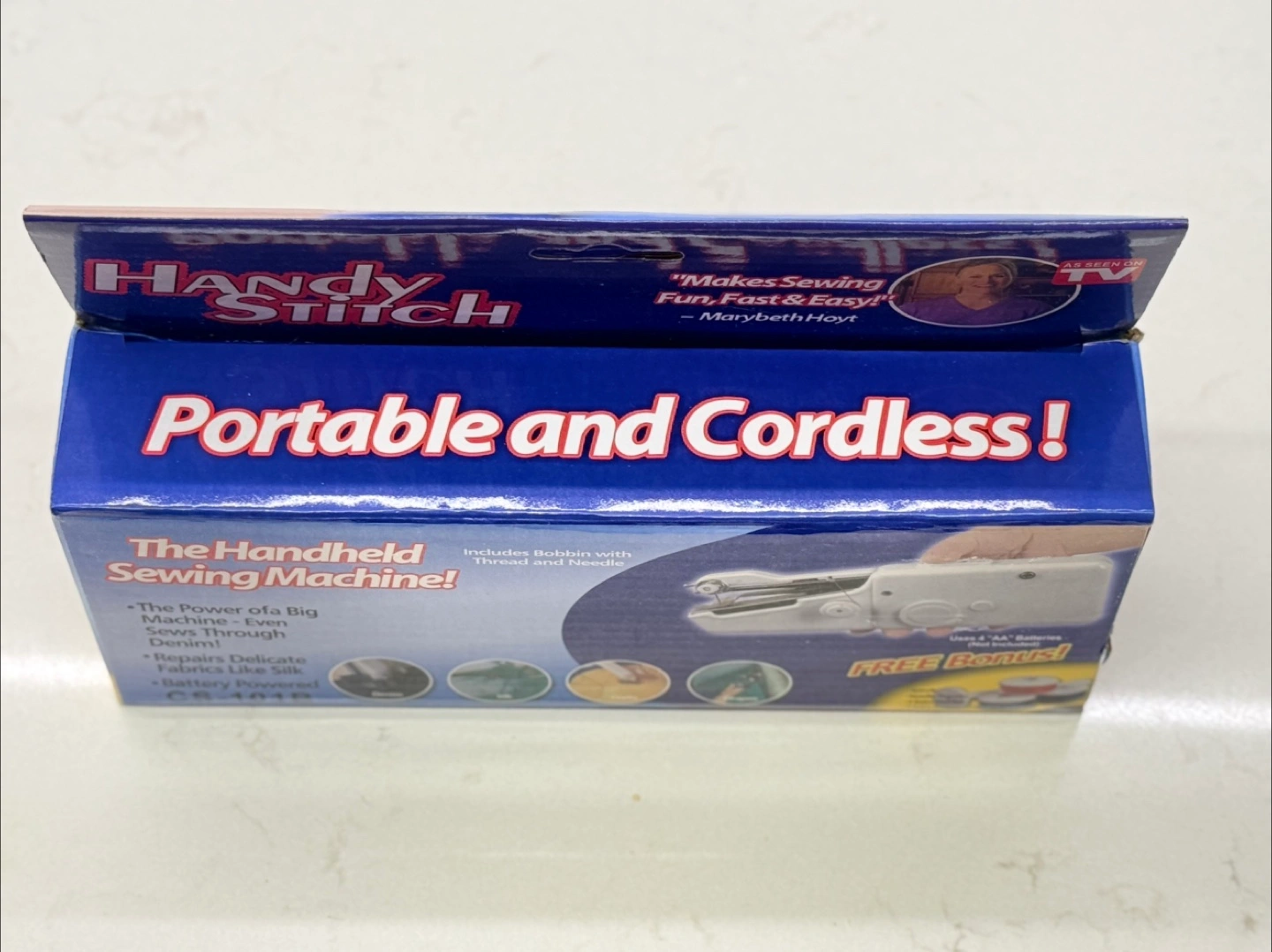 1000+I'm selling a brand new Handy Stitch handheld sewing machine! It's still in its original packaging. - Portable and cordless - Includes bobbin with thread and needle - Can sew through denim and repair delicate fabrics like silk - Battery powered Threaded already, only tested to see if it works. Not used, just like new in the box!