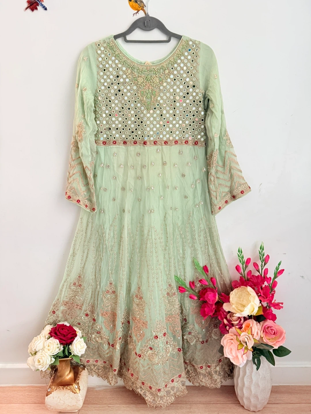 Beautiful green dress with intricate embellishments. Perfect for a special occasion!