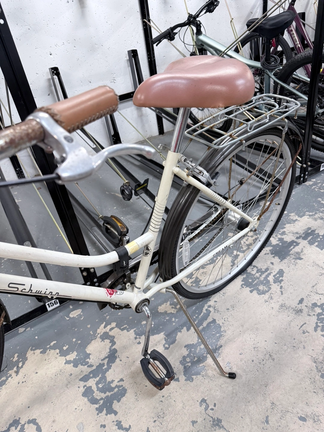 1000+Selling a vintage Schwinn Cream bicycle. The tires are Continental Contact Plus. basket on the front. Flat tire, gear nears reconnection, rusted in spots. Needs love and I don’t have the time!