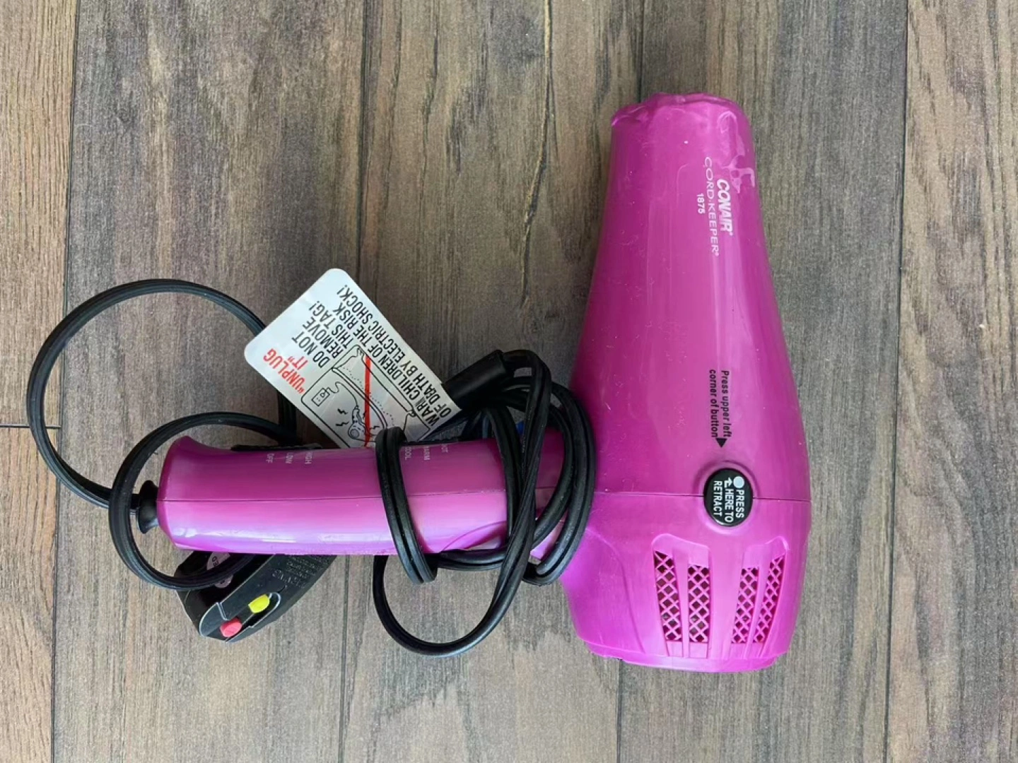 Selling a pink Conair Cord Keeper 1875 hair dryer. It's in good condition and ready to use! It features a retractable cord for easy storage. Just press the button to retract the cord. Perfect for travel or everyday use