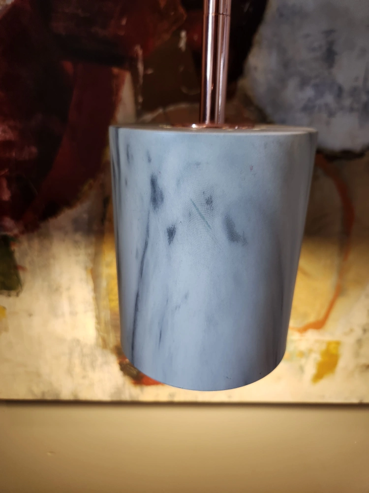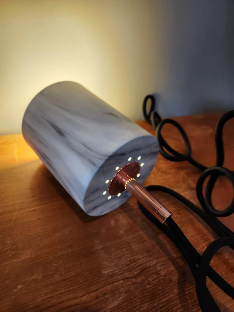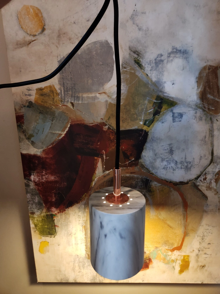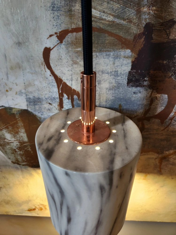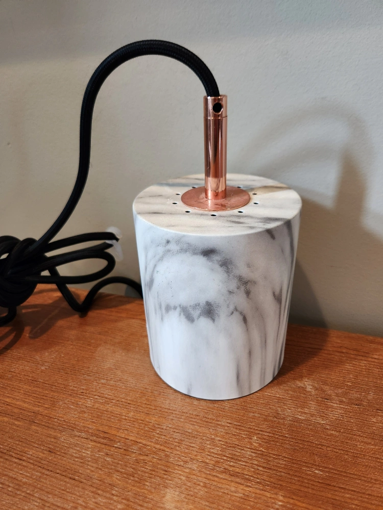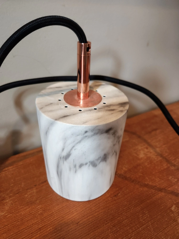 A stylish pendant light featuring a marble-patterned base and copper-coloured accents. It has a modern design that would look great in any room. The black cord adds a nice contrast to the overall look of the lamp. Cord is 15 feet long. Makes great feature light behind your plant babies. Plug in suitable for use with a wall switch OR unplug to shut off lamp.