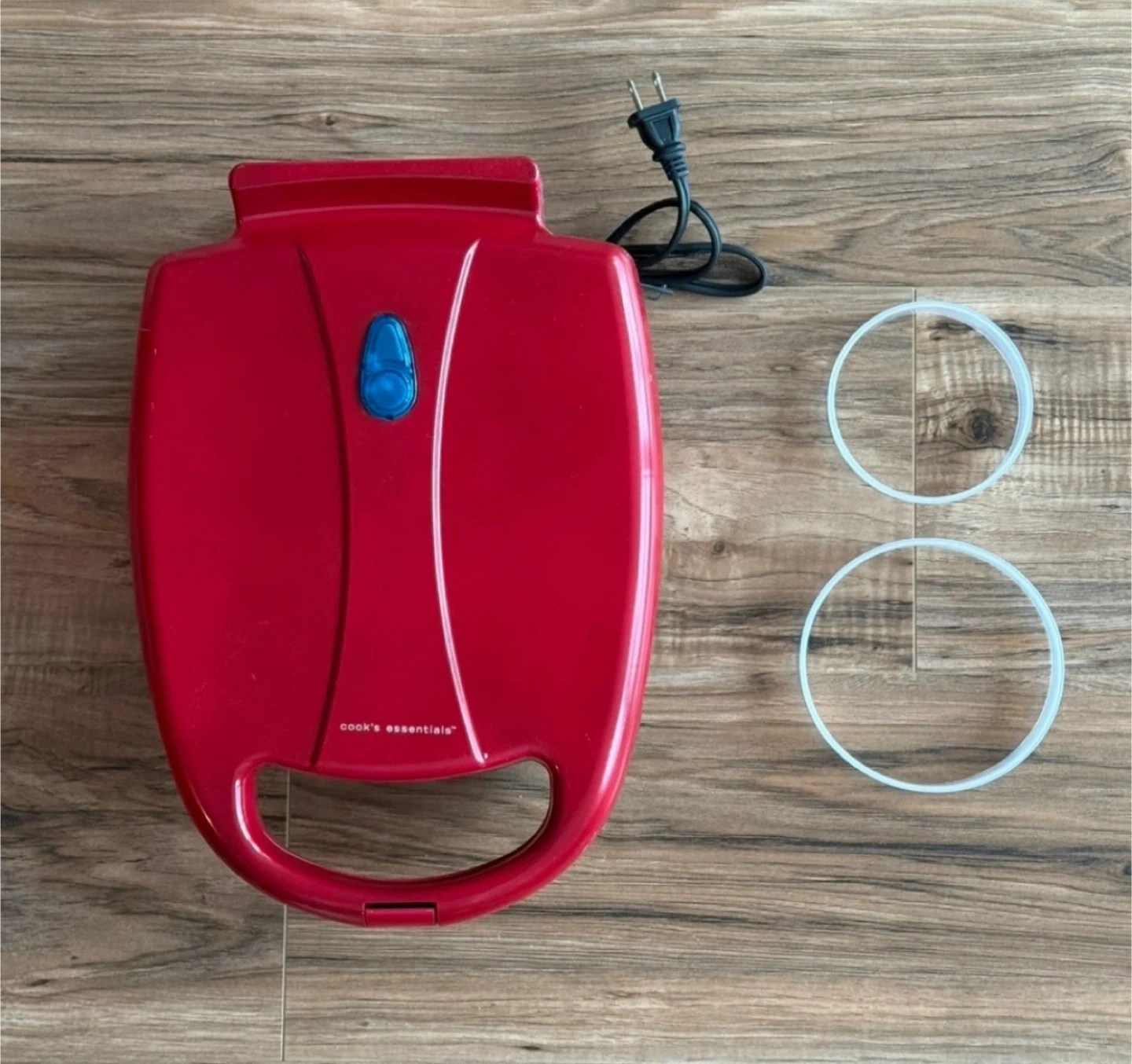 Selling a Cook's Essentials waffle and pancake maker in red! It looks like it's in great shape and ready to make some delicious treats. It also comes with two white rings, which I believe are for making pancakes