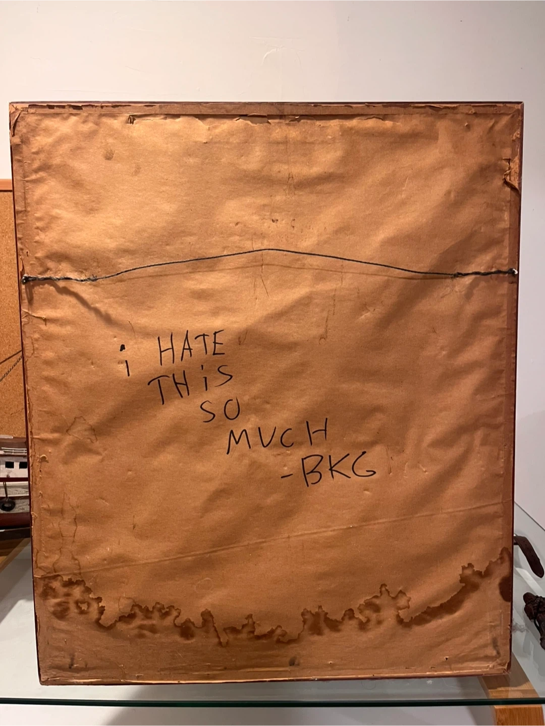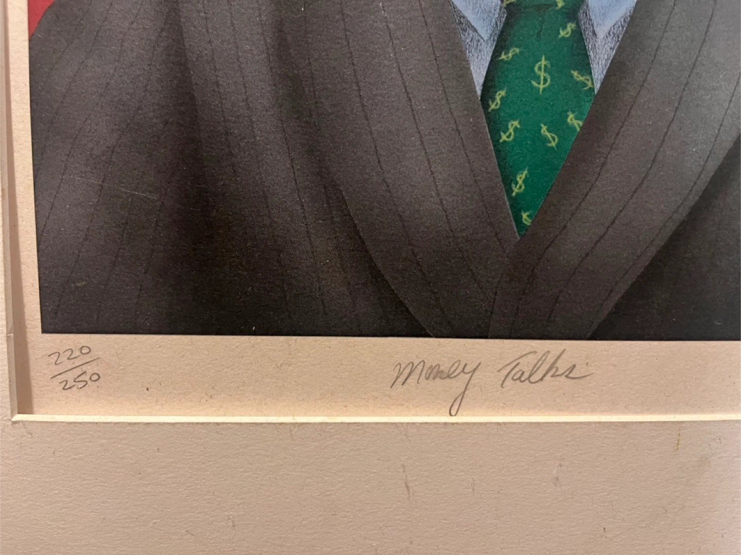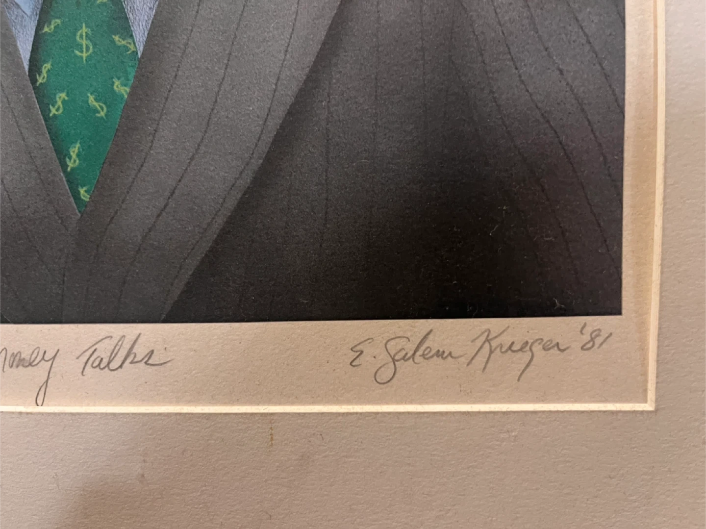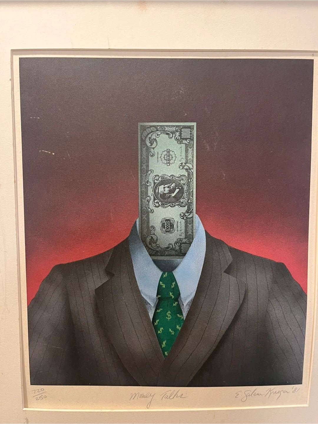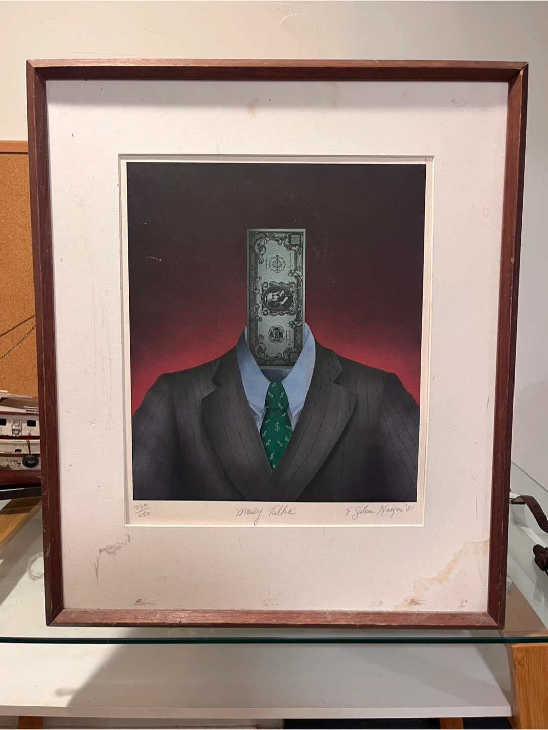 Selling a framed print titled 'Money Talks' by E. Salem Krieger, created in 1981. It's number 220 out of 250 prints. The piece features a suit with a $1000 dollar bill for a head and a green tie with dollar signs. Hideous IMO BUT The work was a 1981 New York City classic during Reagan's inauguration. The piece retails for up to $400 - Some subtle damage on the print but in good condition - the boarder of the framed piece may need to be replaced.
