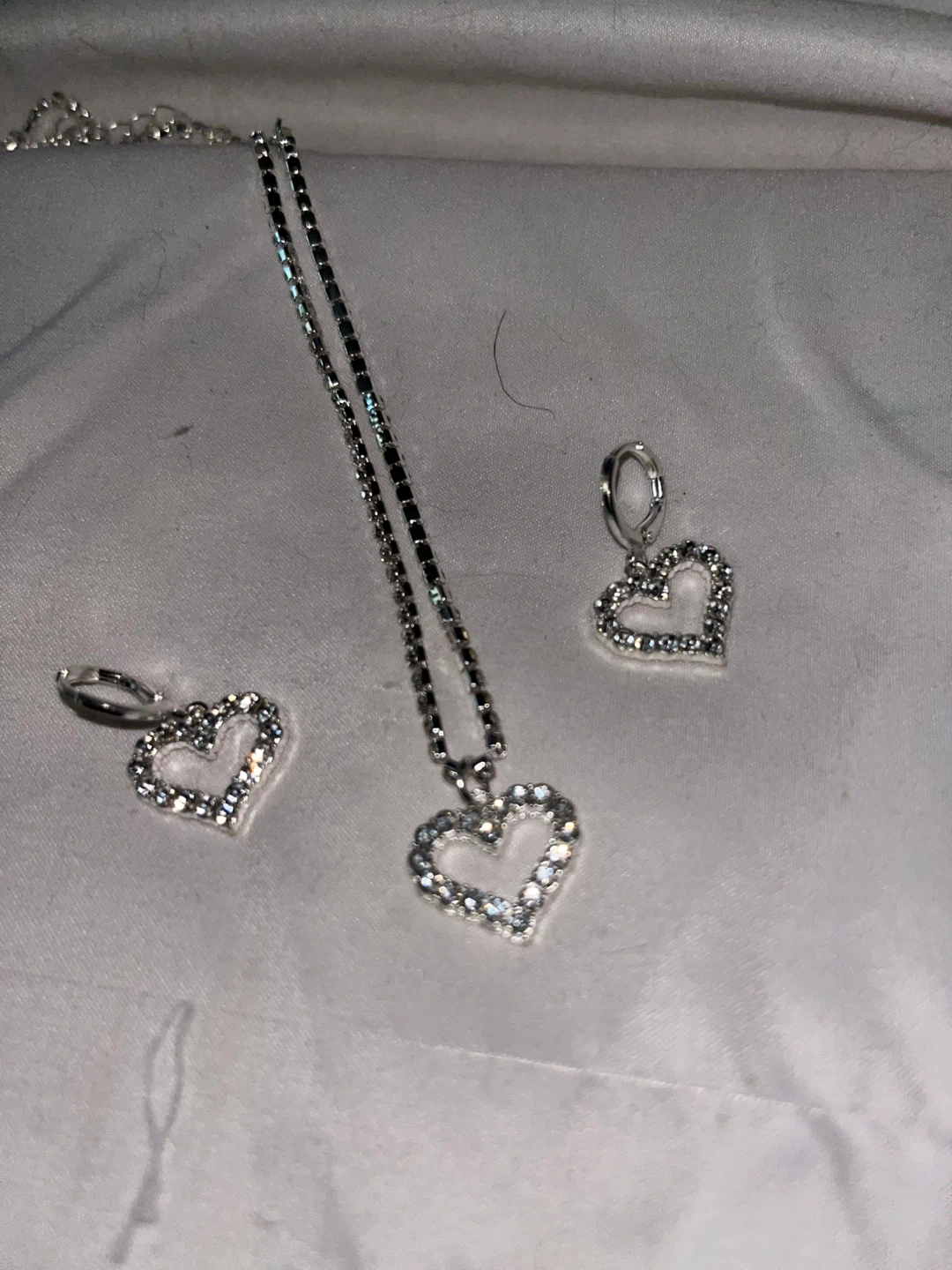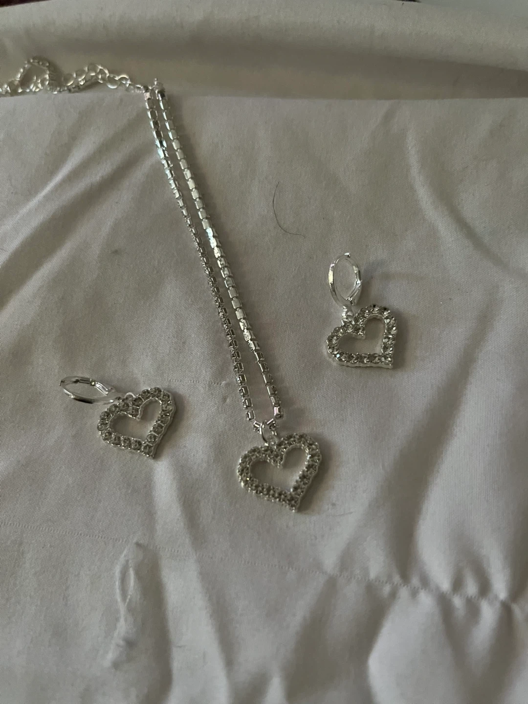 Selling a cute heart-shaped necklace and earring set. The set is silver-colored with sparkling accents, perfect for adding a touch of shine to any outfit! It's in great/New condition and ready for a new home