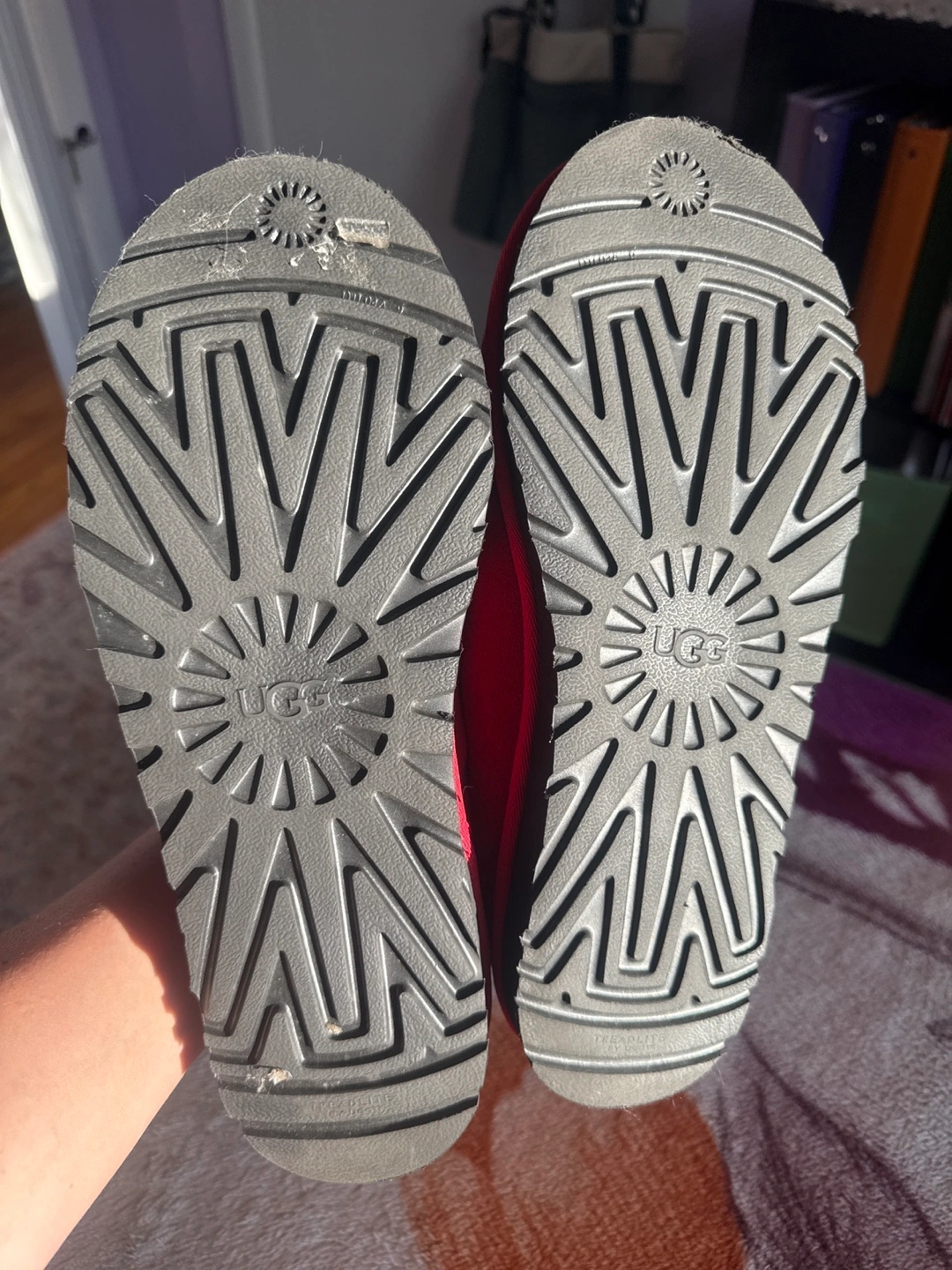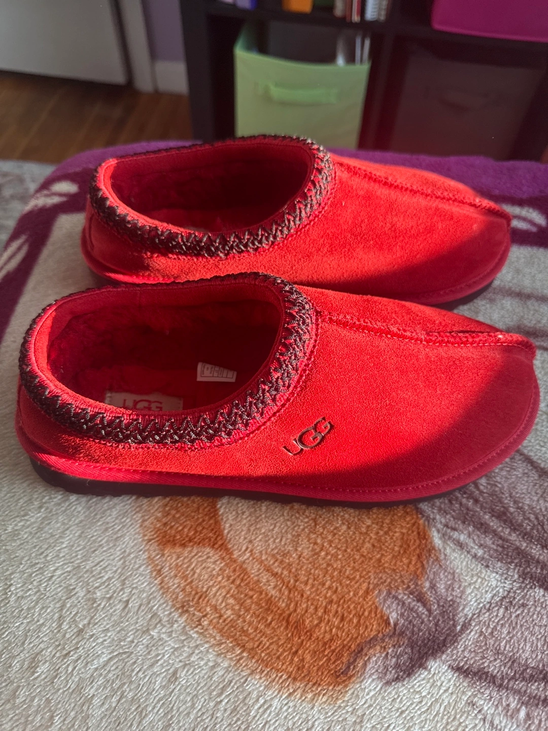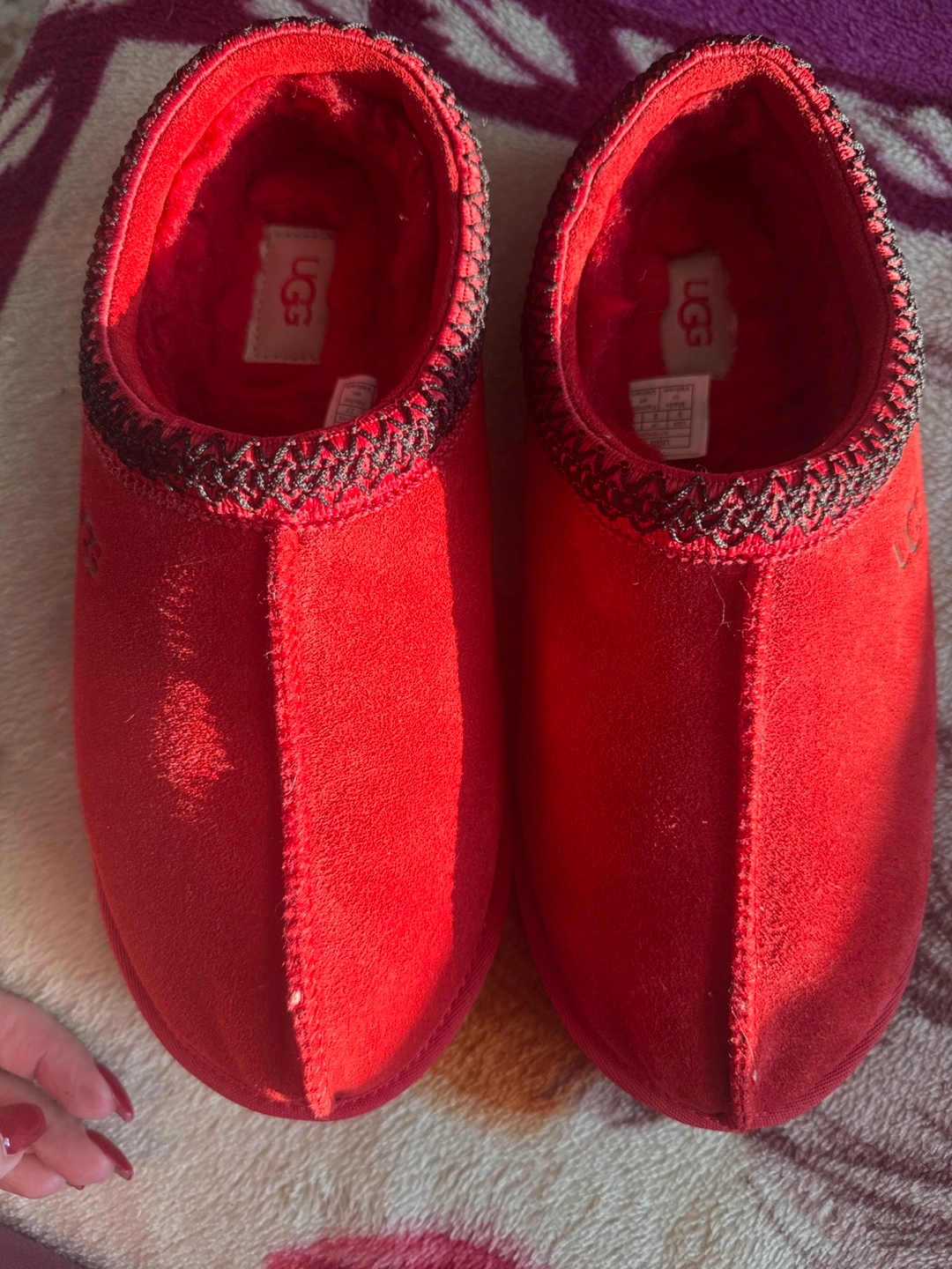 65Selling a pair of red UGG slippers! They are made of suede and have a cozy interior. The soles show some signs of wear, but overall they are in good condition and ready for a new home