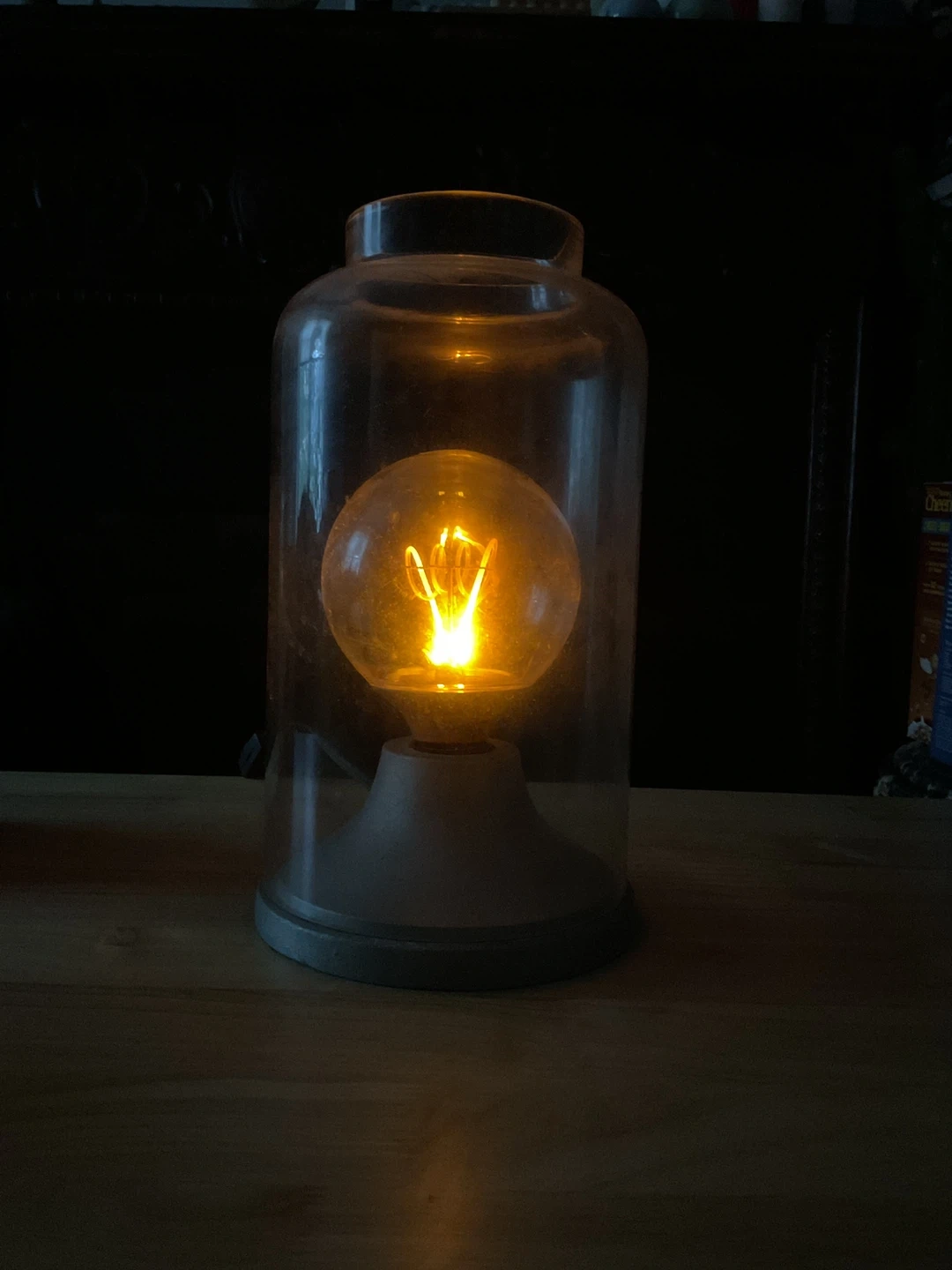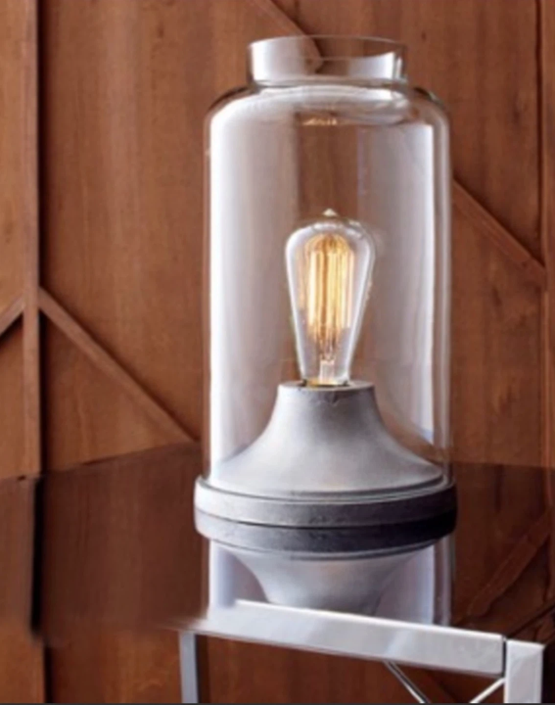 The lamp features a clear glass cloche and a gray base, giving it a modern and stylish look.