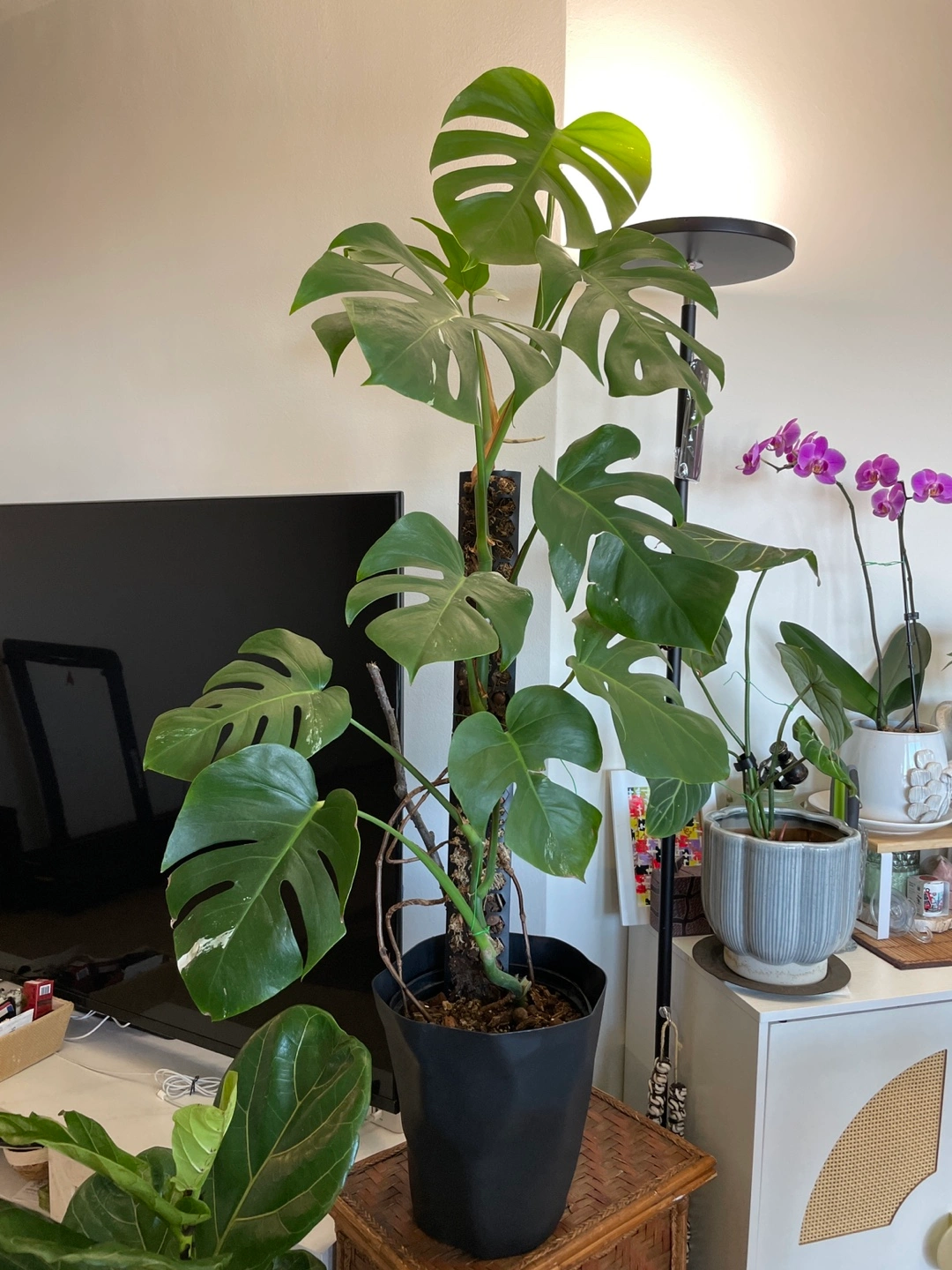 Selling a healthy Monstera plant! It's a beautiful addition to any home and relatively easy to care for. It comes with a support pole to help it grow upwards. The leaves are a vibrant green, and it's currently potted in a black plastic pot.
