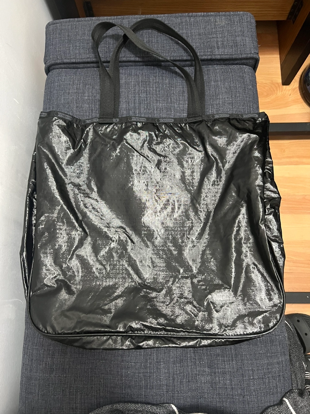 150Selling a black LeSportsac tote bag! It's in great condition. This tote is perfect for everyday use, whether you're heading to work, running errands, or going to the gym. It's lightweight and easy to carry around