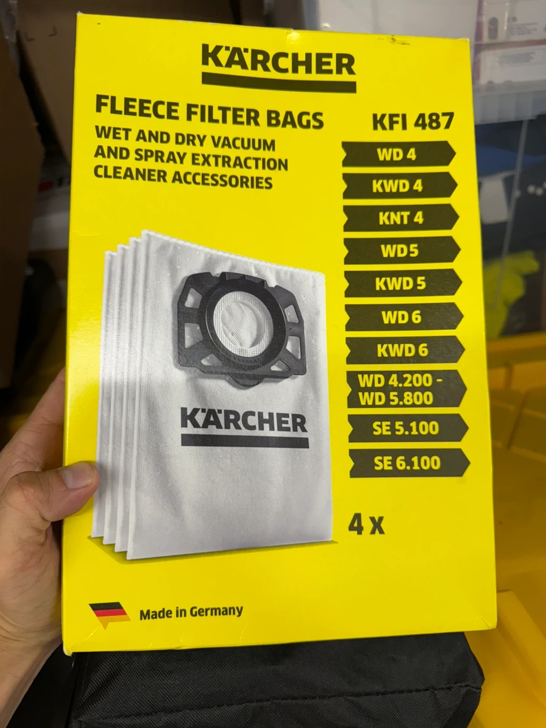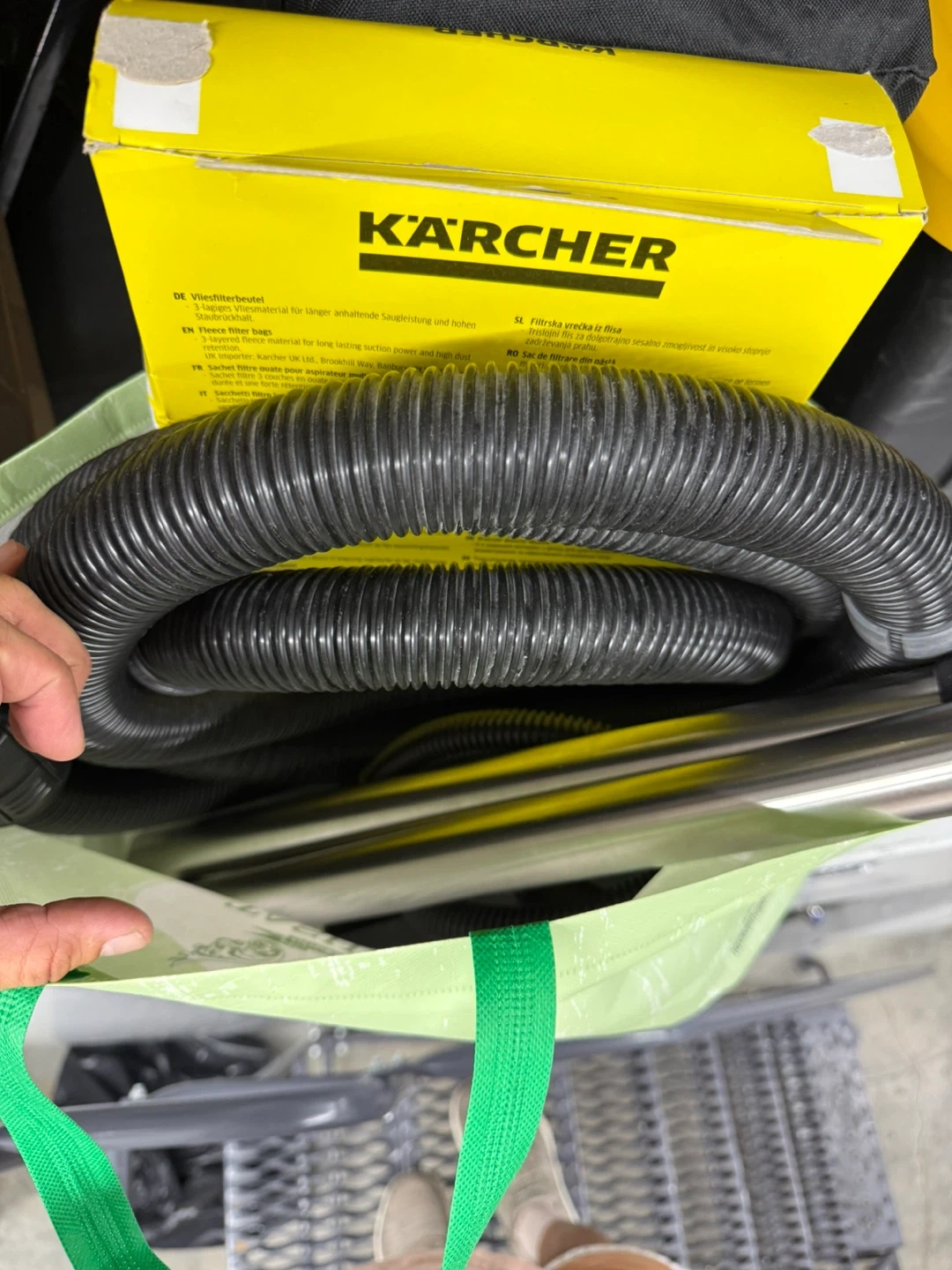 The set includes: The Karcher WD 6 P S, 11.5 ft. suction hose, 2x stainless steel extension tubes, floor nozzle, crevice nozzle, adapter for power tools, additional flexible suction hose, 3-layered fleece filter bag, and a flat pleated filter