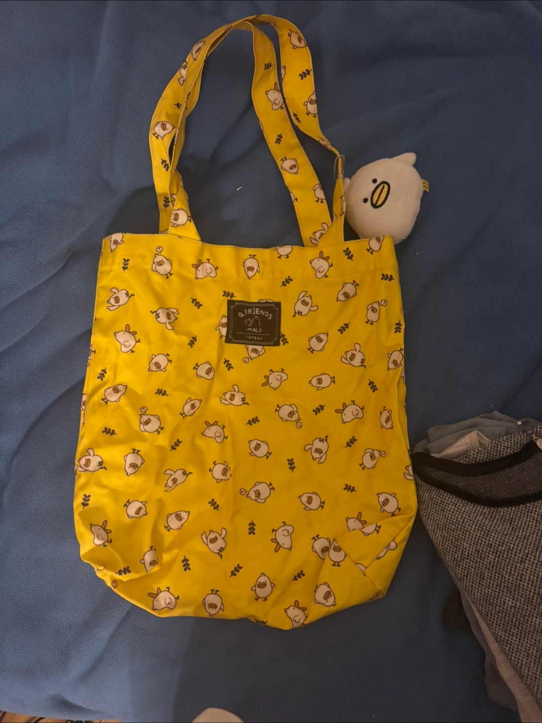 Selling a cute yellow G-Friends Topbag tote bag! It features a fun pattern and is perfect for carrying your everyday essentials. The bag is in great condition and ready for a new home