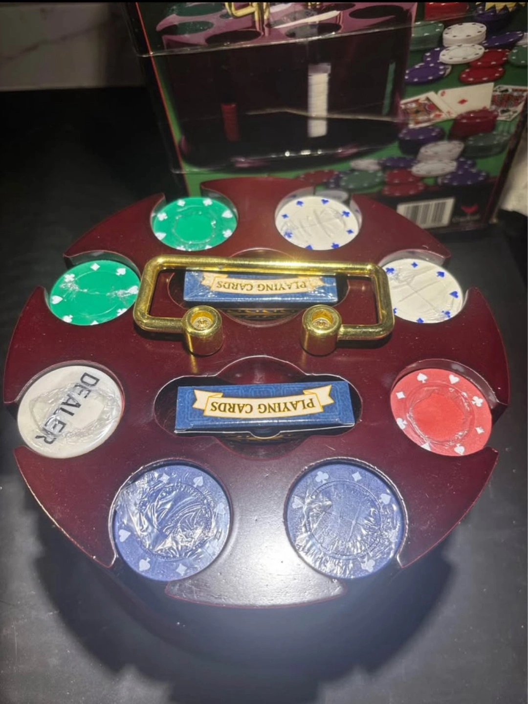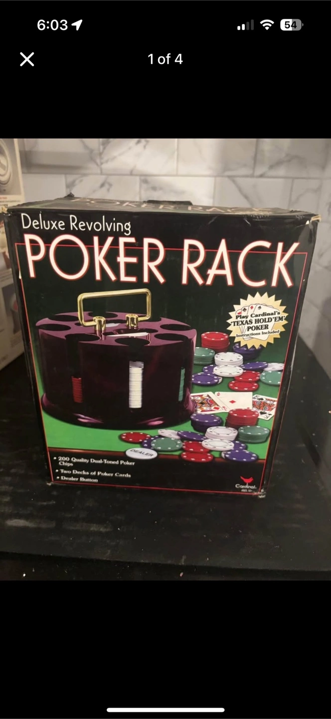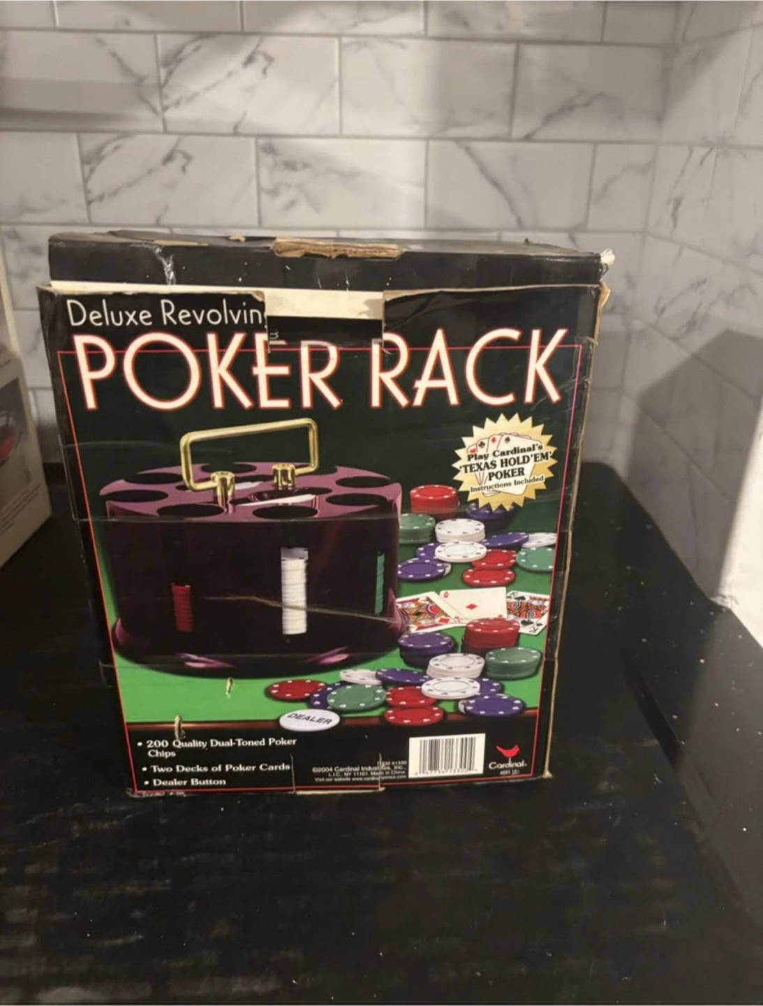 Selling a Deluxe Revolving Poker Rack by Cardinal. It includes 200 quality dual-toned poker chips, two decks of poker cards, and a dealer button. Perfect for your next poker night!