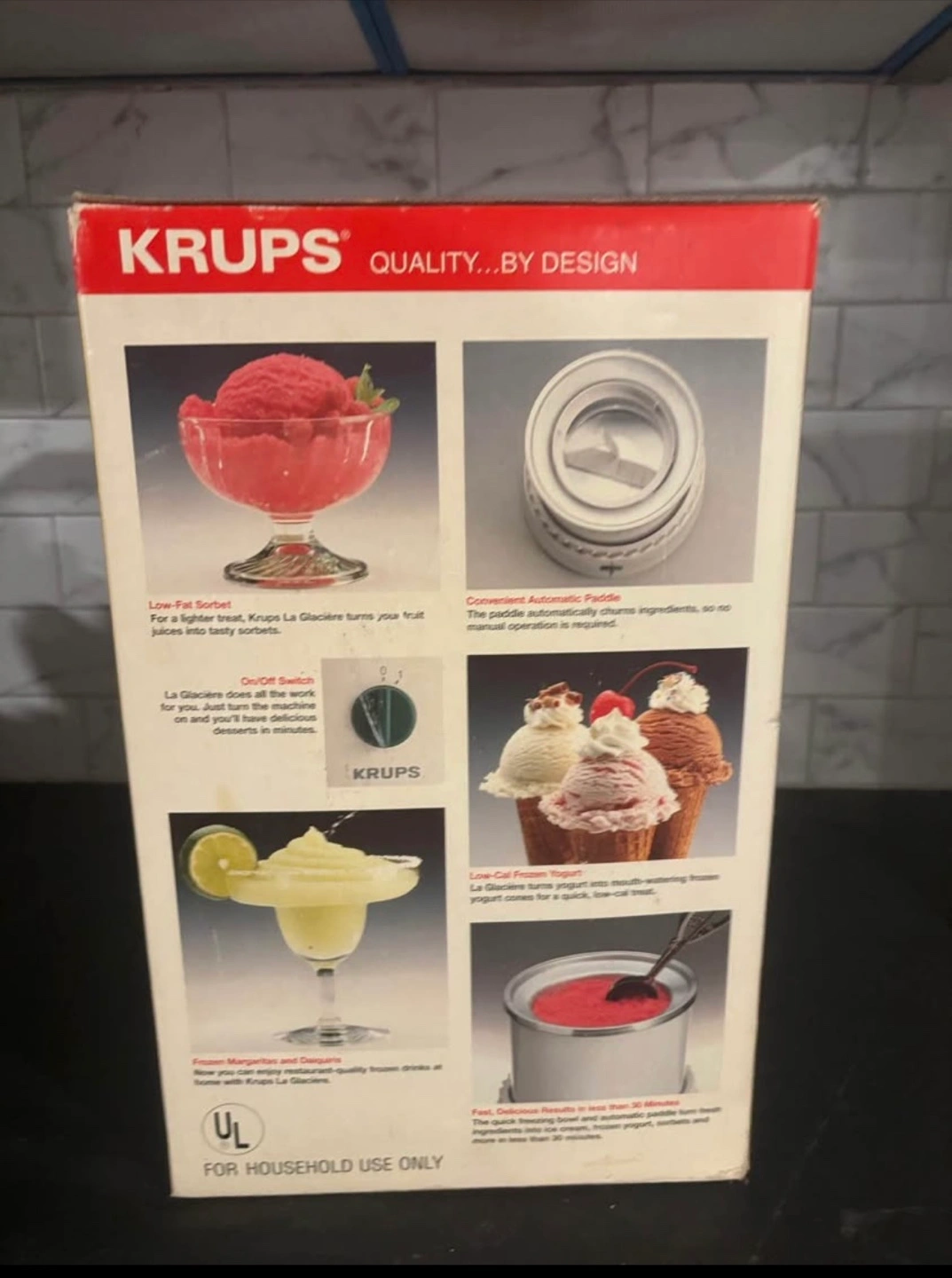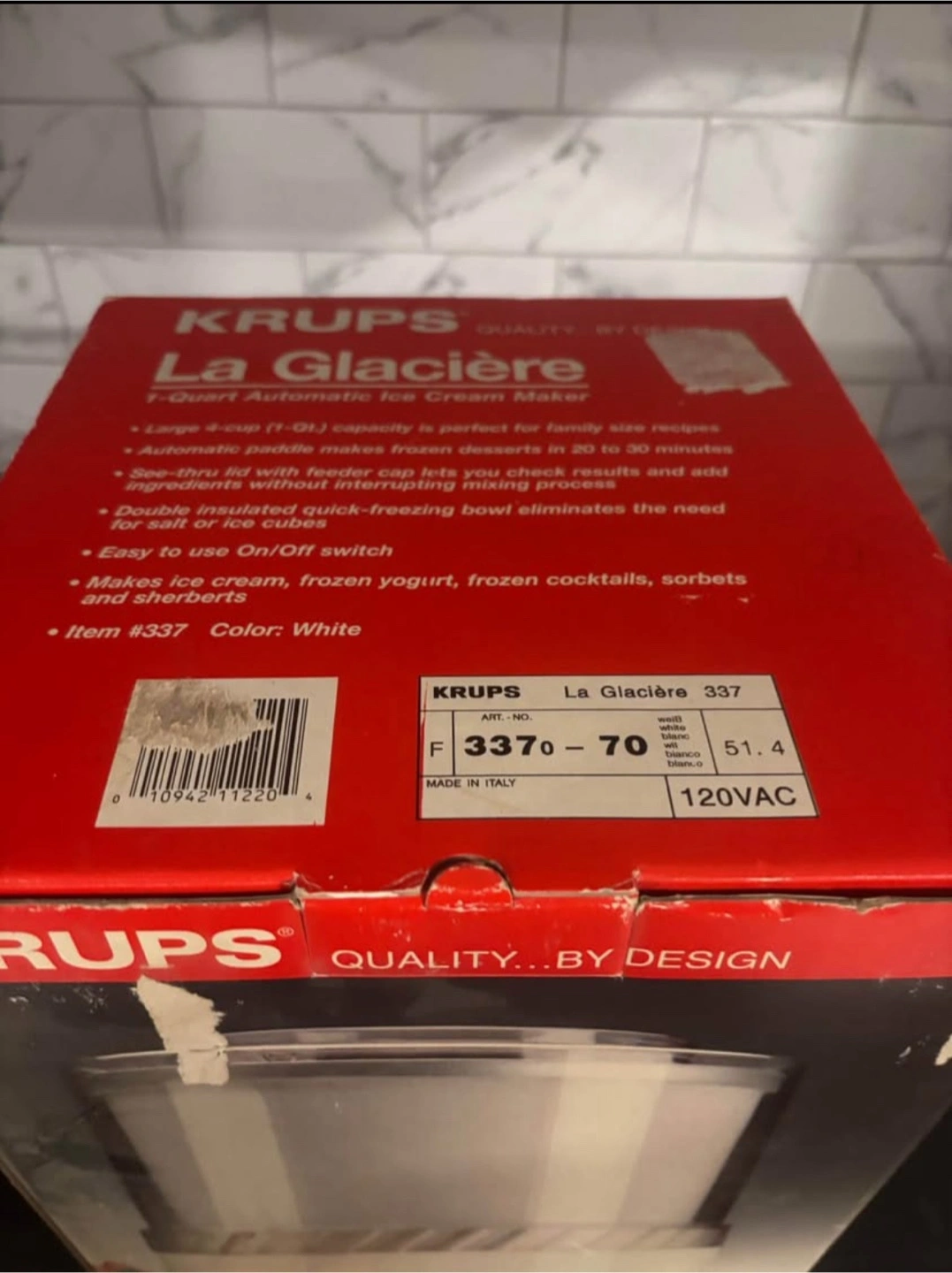 Selling a Krups La Glaciere ice cream maker. It's a 1-quart automatic model, perfect for making ice cream, frozen yogurt, frozen cocktails, sorbets, and sherberts. It features an easy-to-use on/off switch. The item number is #337 and the color is white. Box included!