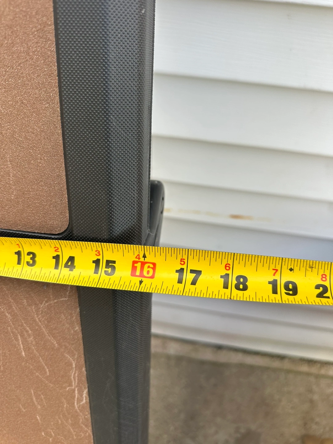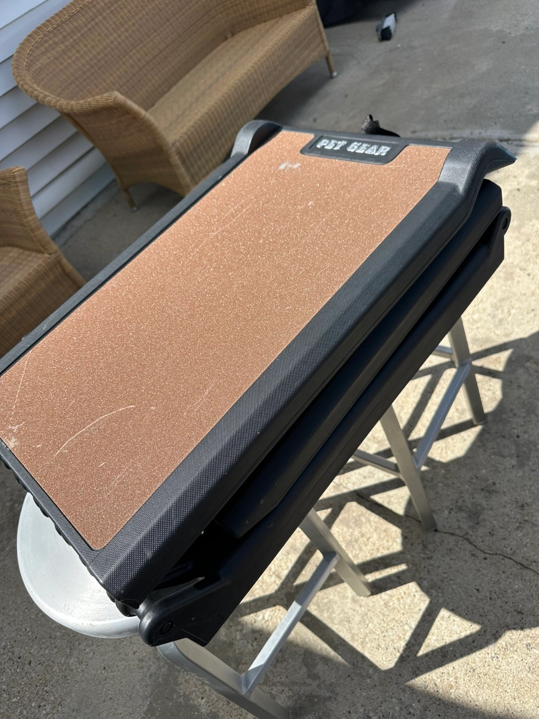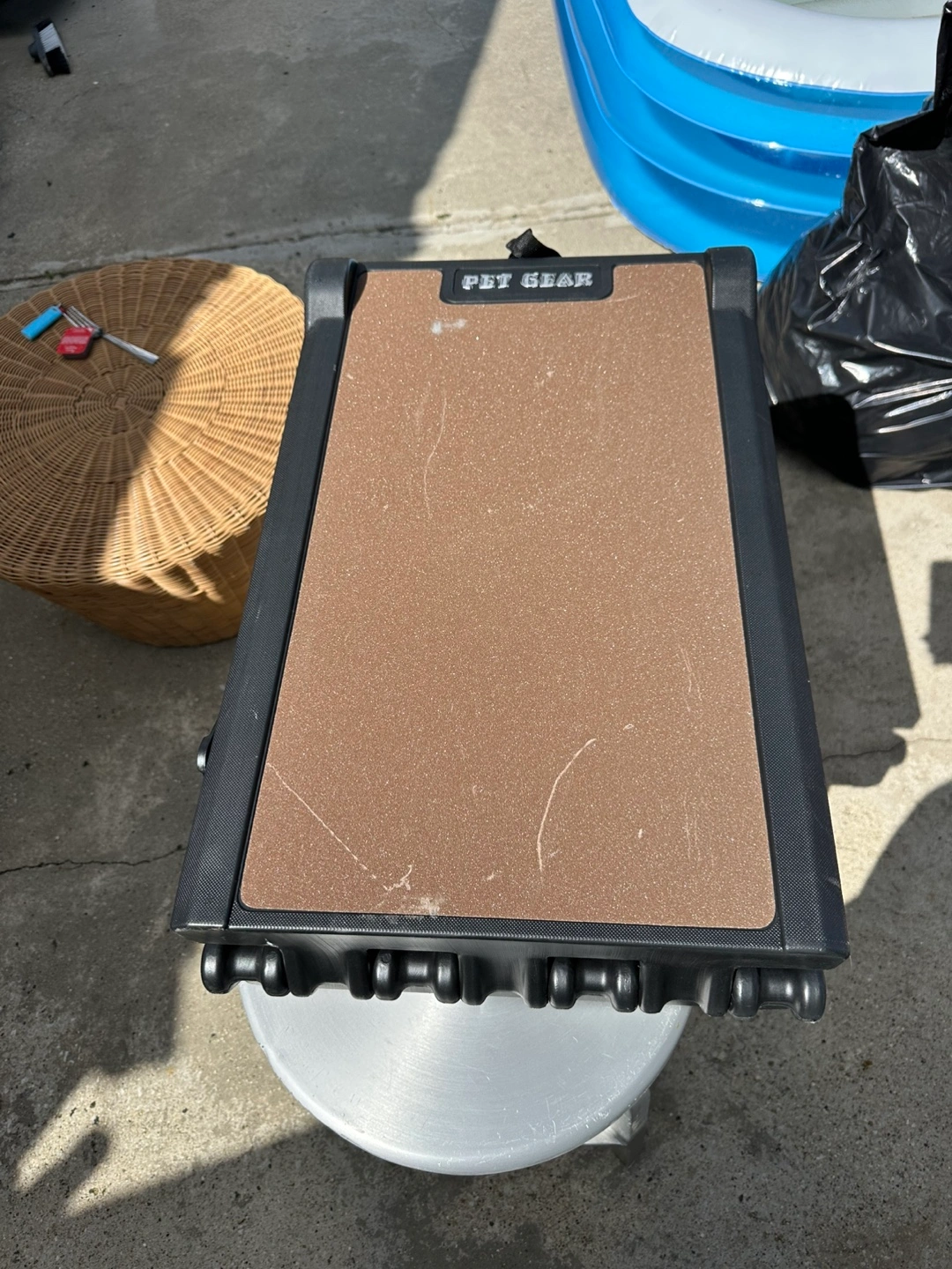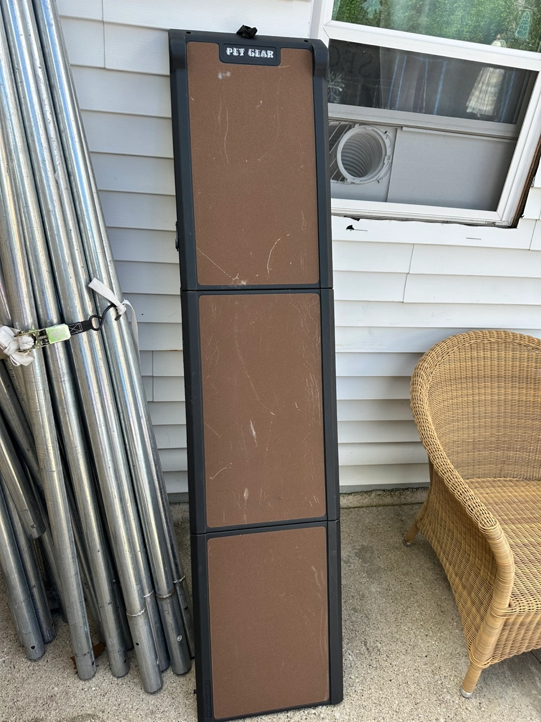 130Selling a Pet Gear Tri-Fold Pet Ramp! It's super handy for helping your furry friend get into cars or reach higher places. It has a brown walking surface and a black frame. When folded, it's about 16 inches wide, and when fully extended, it measures around 72 inches long. It does show some signs of use, but it's still in good working condition!