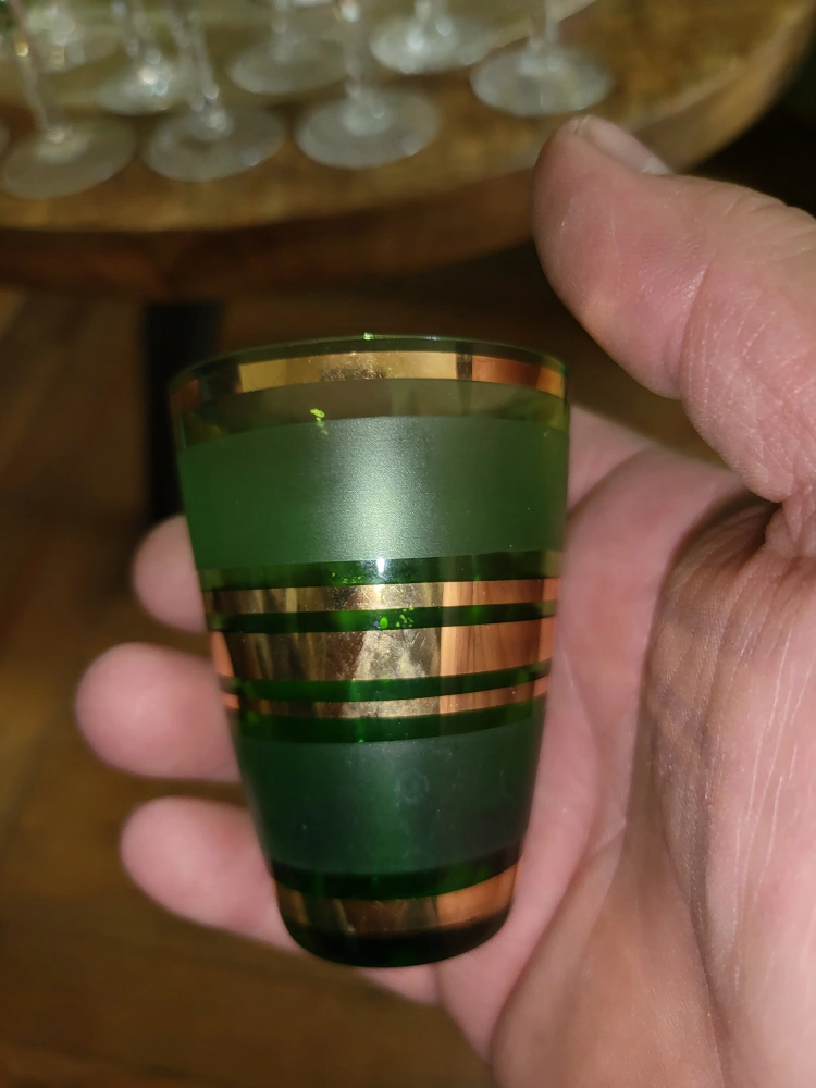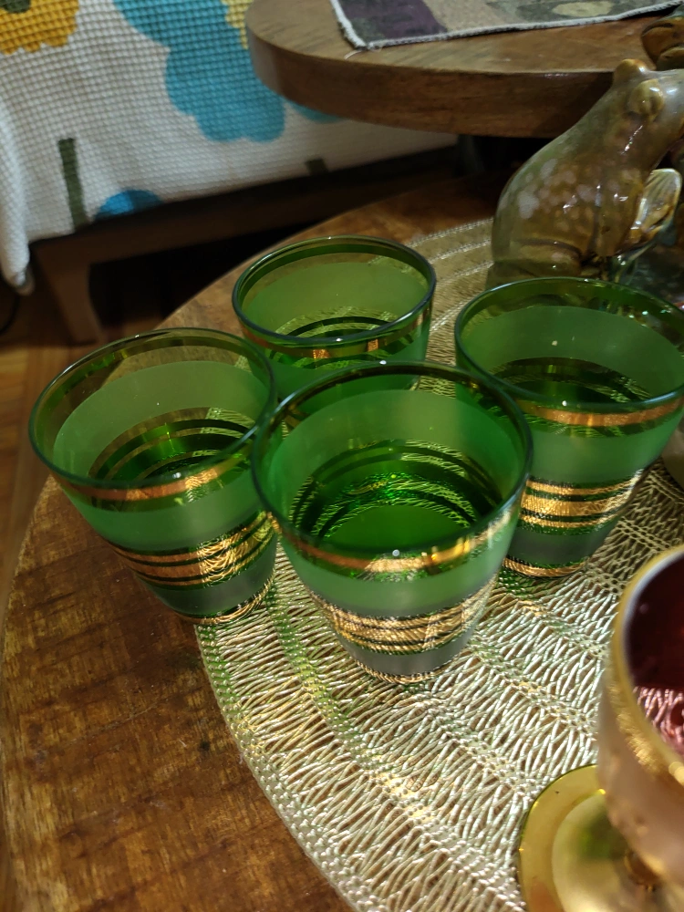 Selling a set of four green shot glasses with gold bands. They're in great condition and ready for a new home! Perfect for adding a touch of vintage charm to your barware collection