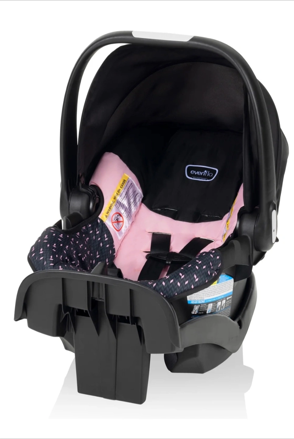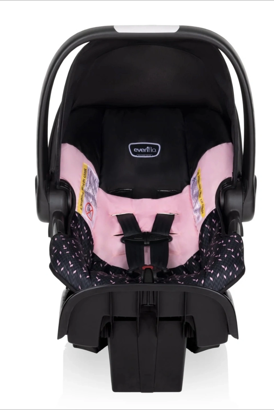 I'm selling an Evenflo infant car seat. It's black and pink, and in great condition! It's perfect for keeping your little one safe and secure while on the go