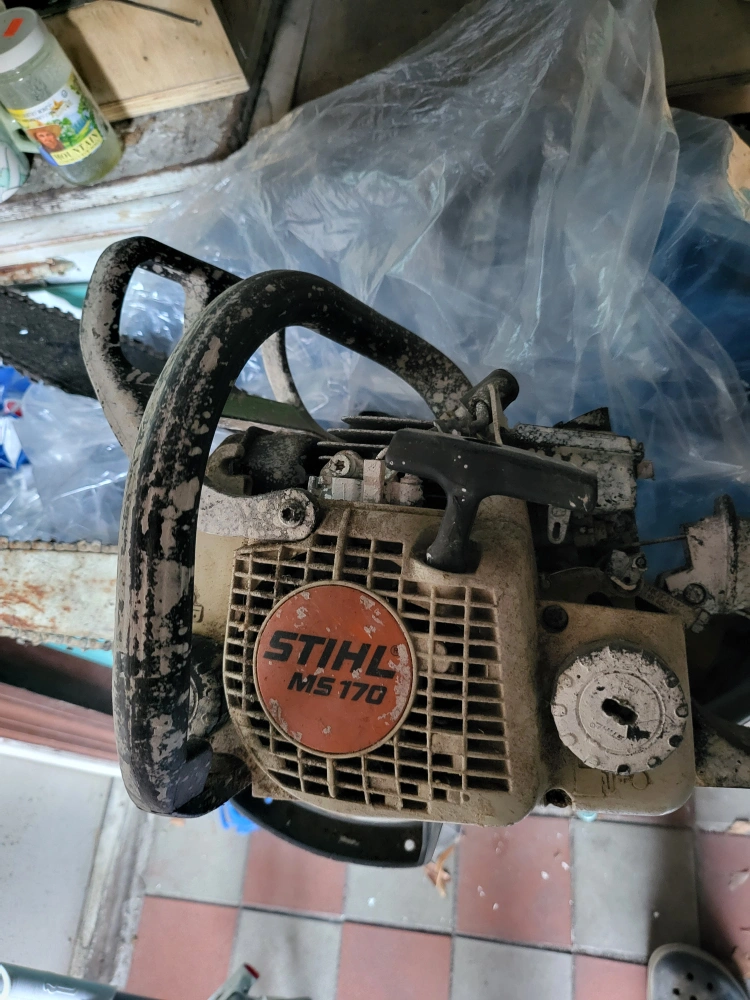 Selling a Stihl MS 170 chainsaw. It shows signs of use. needs fixing, it starts if you put gas in the plug...