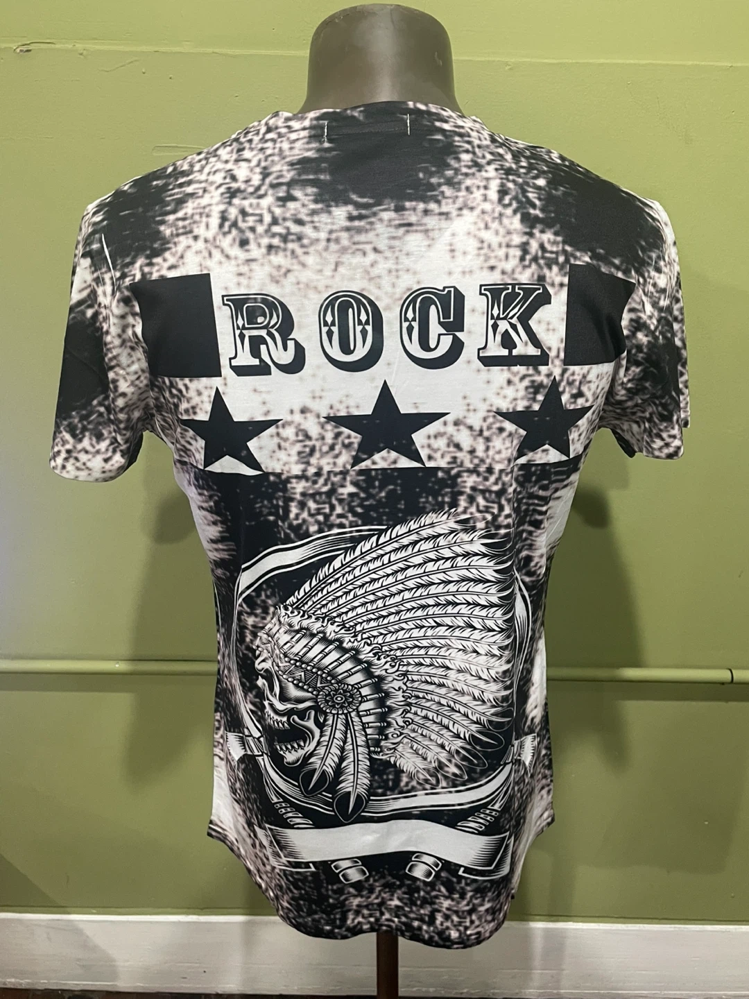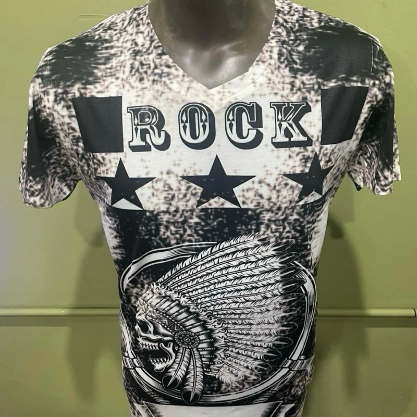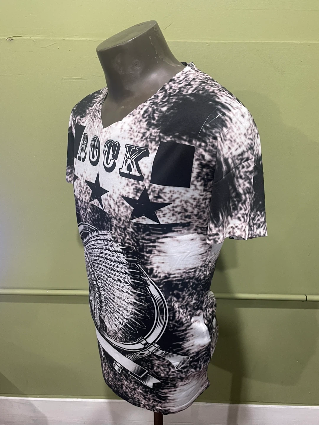 Cool Rock graphic t-shirt with a unique design! Features a V-neck and a bold print. Perfect for casual wear!
