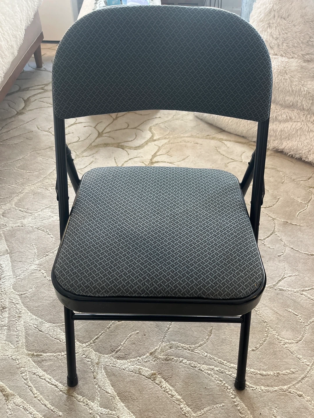 240Selling a folding chair in gray. It's in good condition and perfect for extra seating when you need it! Folds up easily for storage