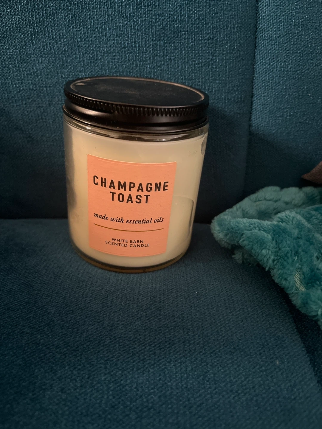 Selling a White Barn scented candle in the Champagne Toast scent. It's made with essential oils. Perfect for creating a cozy atmosphere in your home!