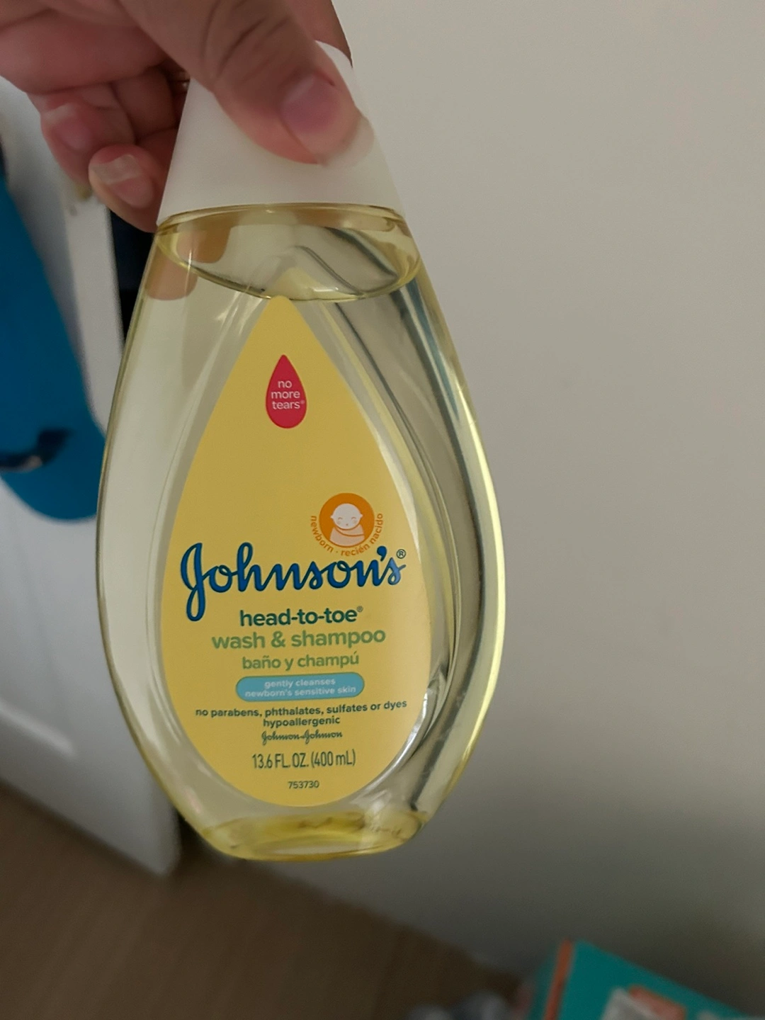 a bottle of Johnson's Head-To-Toe Wash & Shampoo. It's a gentle cleanser for newborn's sensitive skin, hypoallergenic, and has the no more tears formula. This bottle contains 13.6 fl oz (400 mL).