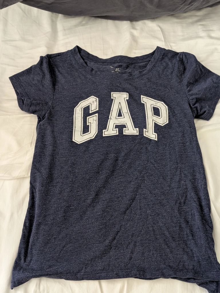 Here's a gently used navy blue T-shirt from GAP. It has the classic GAP logo on the front. Perfect for casual wear. Size M