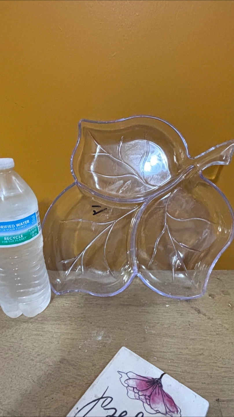 1000+This is a clear plastic serving dish shaped like a leaf. It's perfect for serving snacks or appetizers at your next gathering. It is in great condition and ready for a new home!