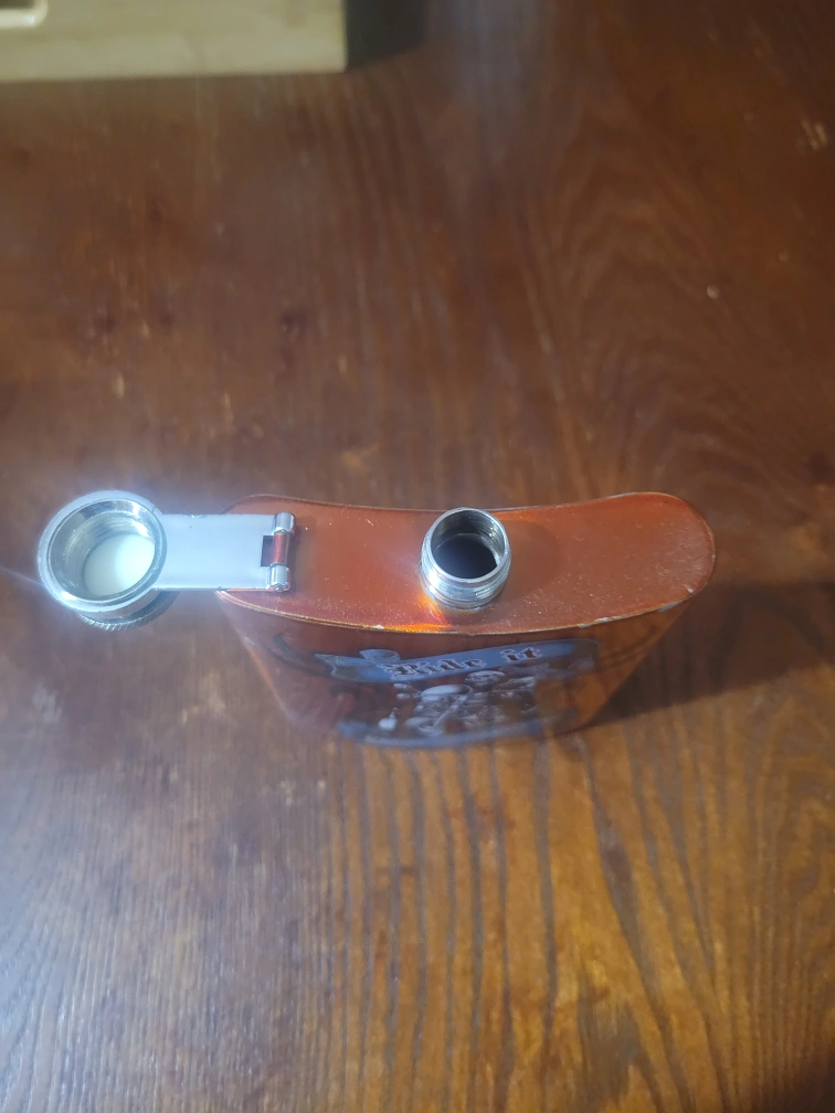 76This is a metallic orange flask featuring a motorcycle graphic with the phrase "Ride it like you stole it" printed on it. It's in good condition and ready for a new home! Hold 7oz.