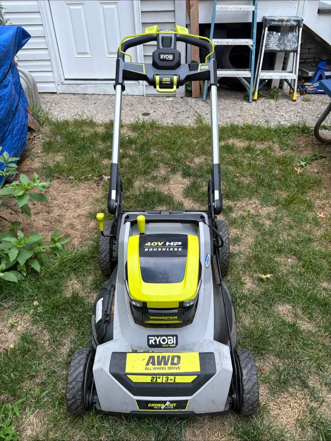 Selling a Ryobi 40V HP Brushless AWD Crosscut 21" 3-in-1 Lawn Mower. It's in great condition and ready to help you keep your lawn looking its best. This model features all-wheel drive for enhanced traction and a brushless motor for increased power and efficiency. It also includes a 40V Lithium 6Ah battery.