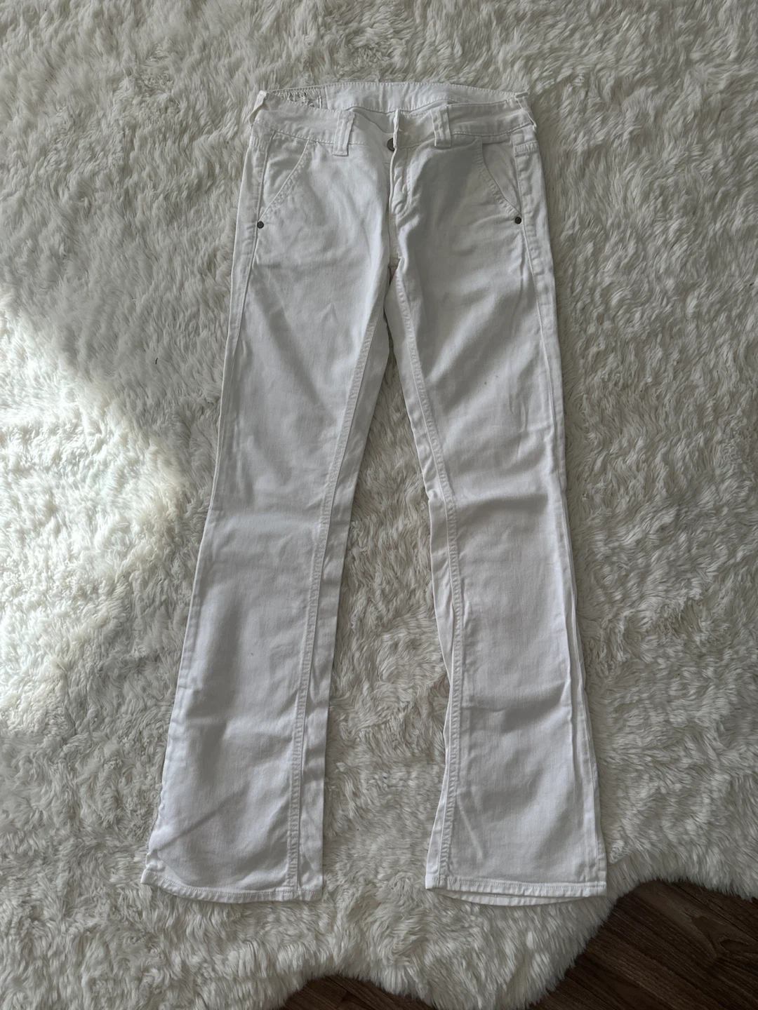 Selling a pair of white denim jeans. They are in good condition and ready for a new home!