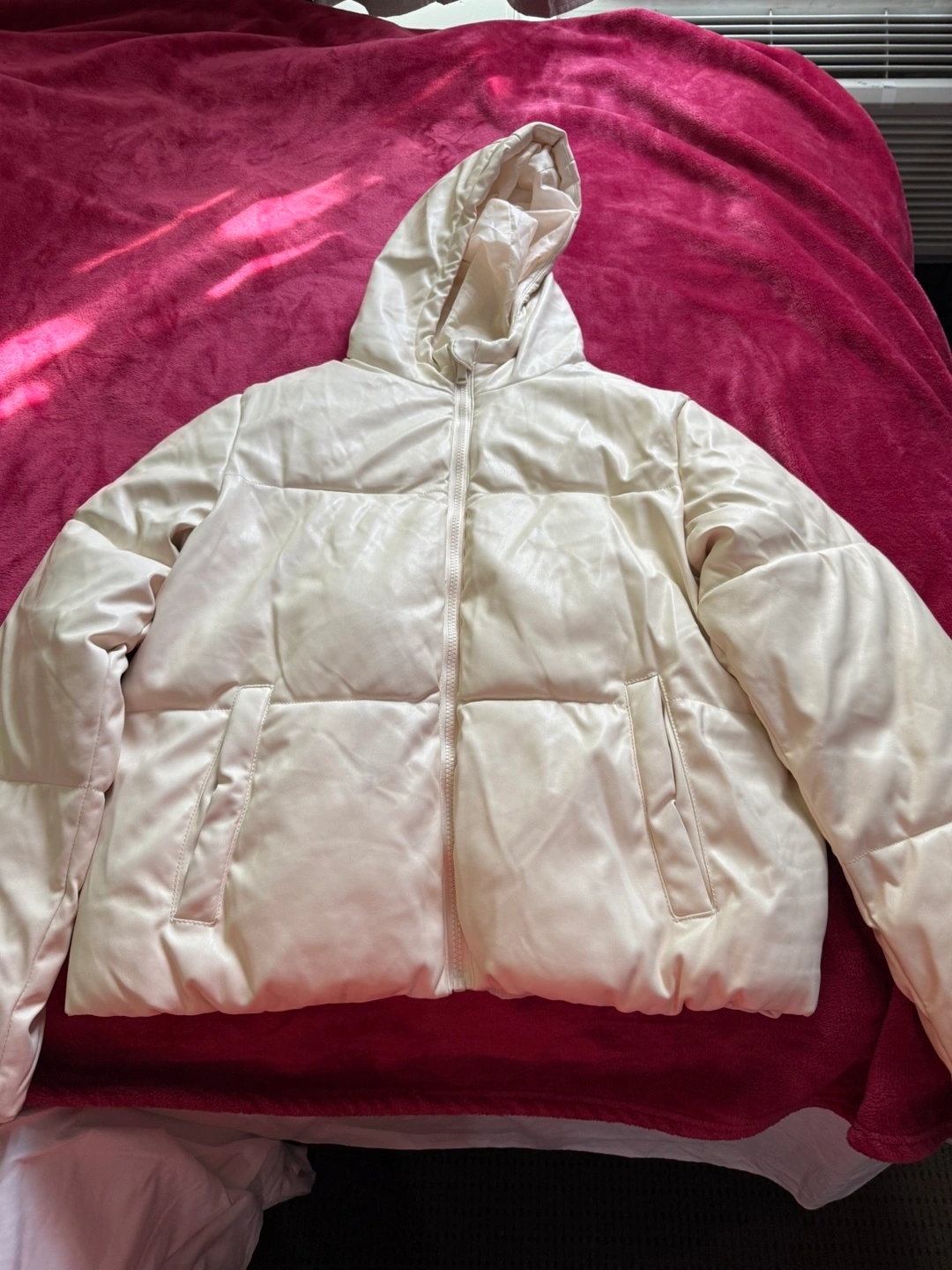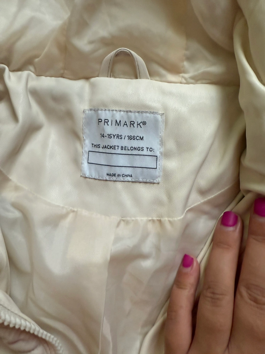 54Selling a Primark puffer jacket in a cream color. It's a size 14-15 years, which is about 166cm. Great for staying warm and stylish!
