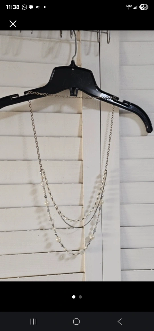 1000+Here's a lovely layered necklace featuring faux pearls and delicate chains. It's in great shape and adds a touch of elegance to any outfit. Perfect for dressing up or adding a bit of sparkle to your everyday look