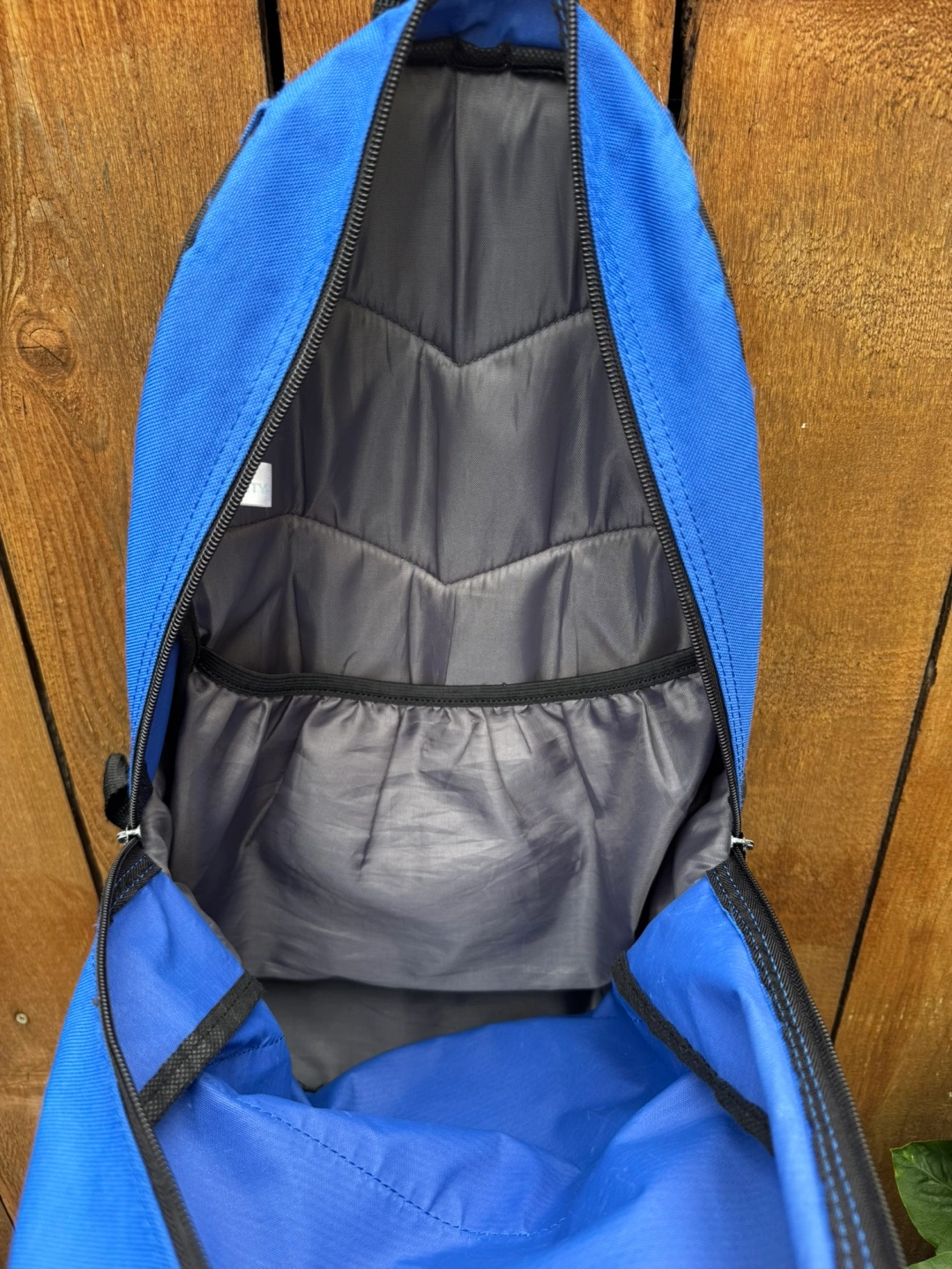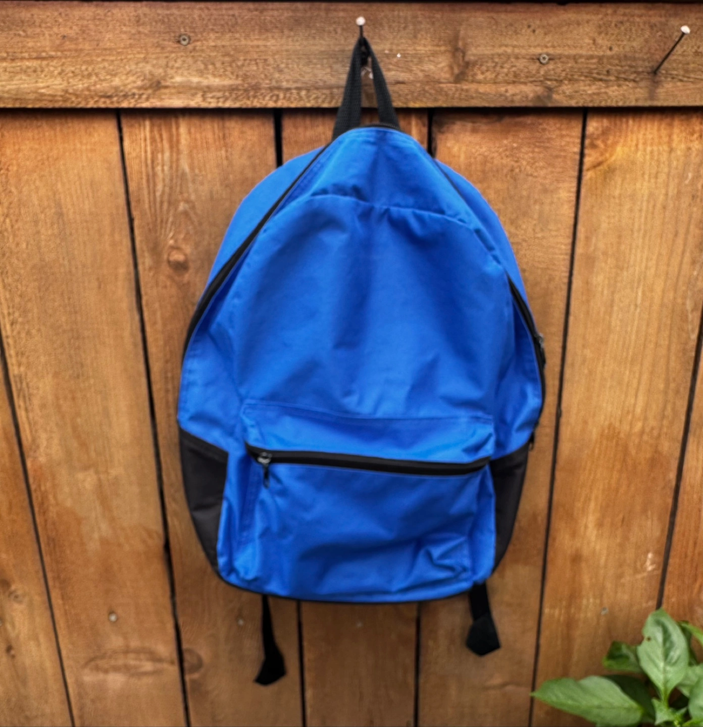 Here's a blue backpack that's in great shape! It features black accents and adjustable straps. The interior is gray and has multiple compartments for organization. Perfect for school, travel, or everyday use!