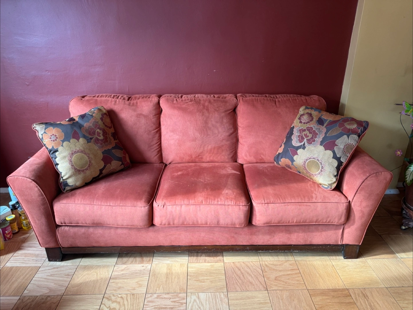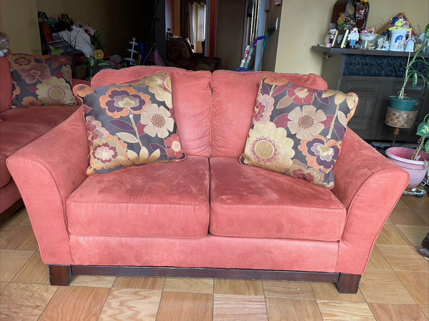 Selling a comfortable couch and loveseat set. The set is a matching pair in a unique color. Pillows included. Perfect for a living room or den!