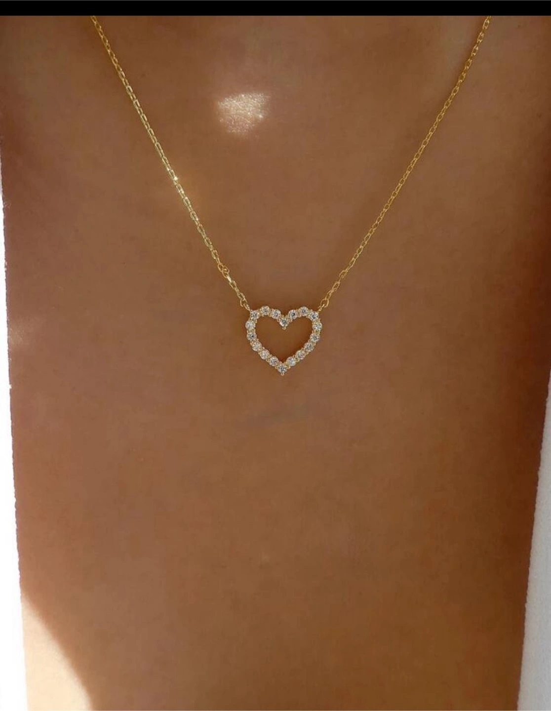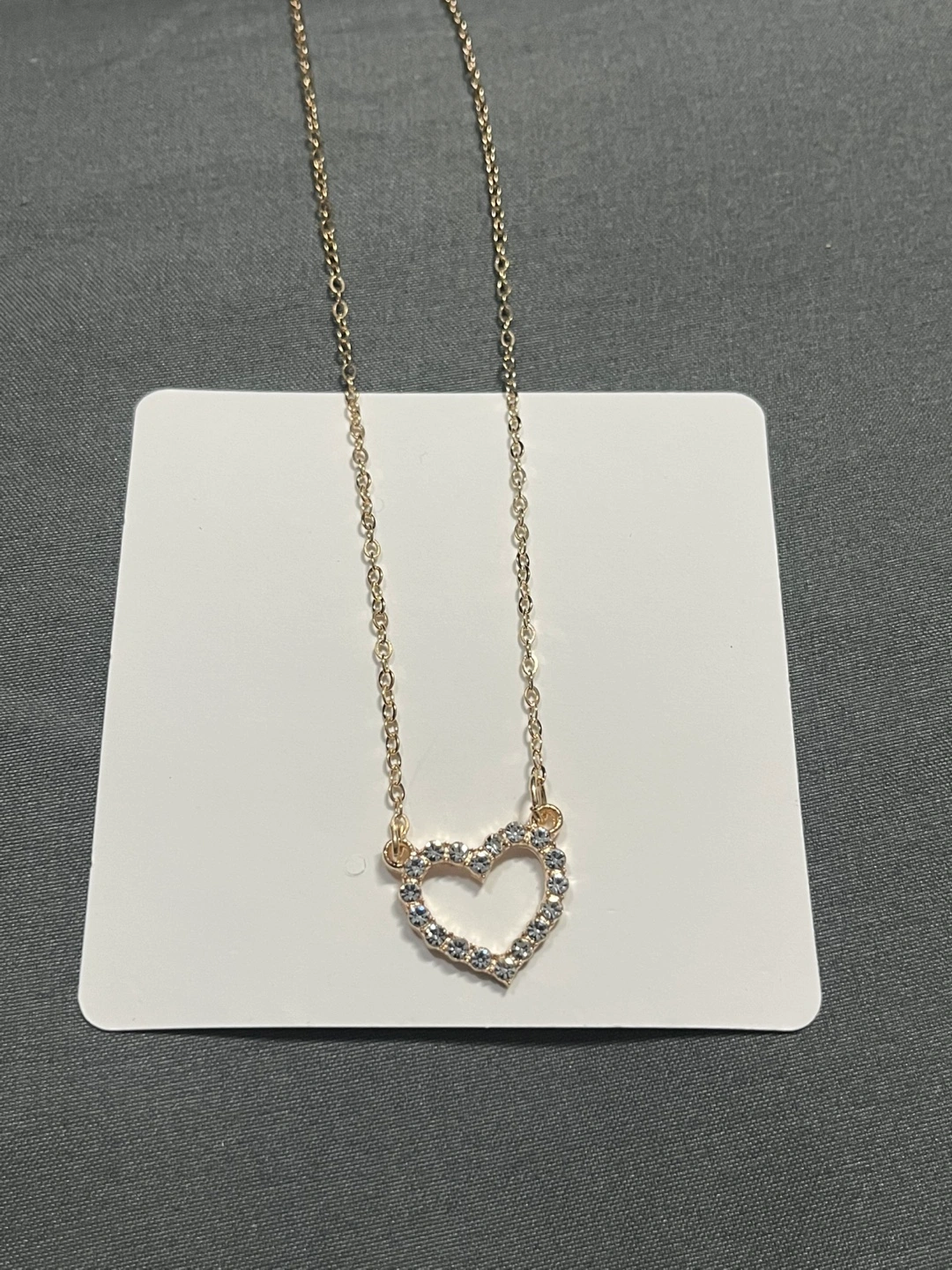 670Selling a cute heart pendant necklace. It's gold in color and has a heart-shaped pendant with small stones. Perfect for adding a touch of sparkle to any outfit