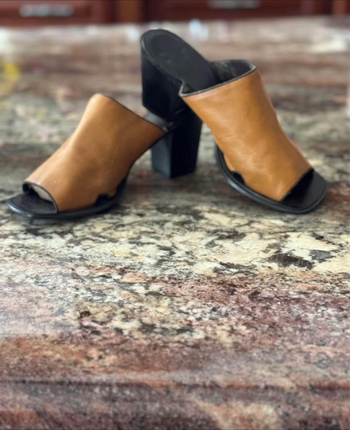 These are a pair of stylish caramel/tan leather mules with a block heel. They feature a square toe and a comfortable slip-on design. The shoes are in good condition, only worn twice. 2 3/4 inch heel. Perfect for adding a touch of elegance to any outfit!