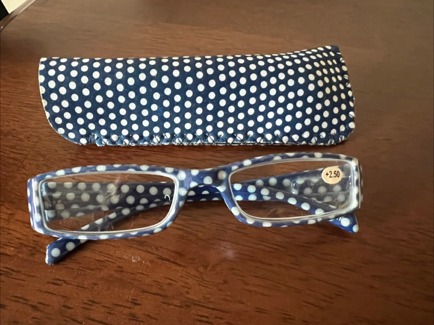 257These are reading glasses with a +2.50 magnification. They have a fun blue and white polka dot pattern. A matching polka dot case is included to keep them safe and scratch-free!