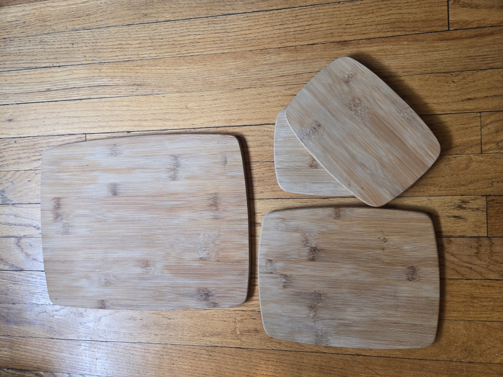 107Selling a set of four bamboo cutting boards. They're in great condition and ready for a new kitchen! The set includes one large, one medium, and two small boatds. Perfect for all your chopping needs.